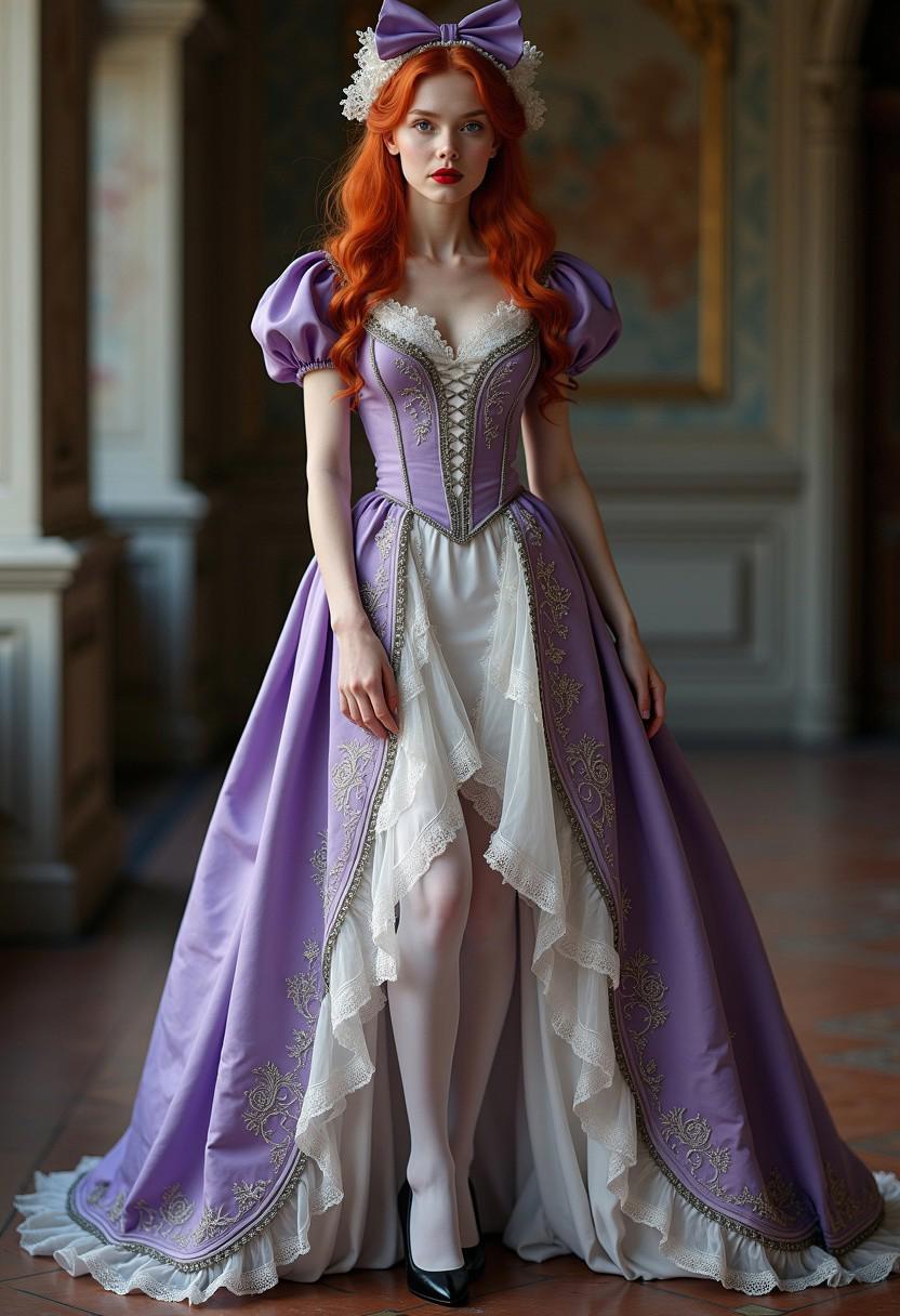 Generate hyper realistic image of a full-body 35mm film photograph of a young redhead woman with slim body dressed in an elaborate violet and white historical-style gown, featuring a fitted bodice with intricate patterns, a flowing skirt, white pantyhose and black high heels. She has long, wavy hair adorned with a large, decorative bow and lace accents, enhancing her vintage aesthetic. Her makeup is polished, highlighting her striking features and bold red lips. The background is softly blurred, emphasizing her presence. realistic skin, natural pores, soft lighting, freckles, wrinkles, human skin details