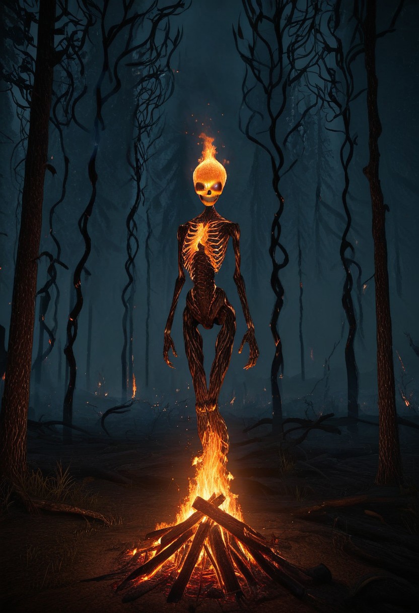 HavvoricFireDarkstyle, masterpiece, High Details, High Quality, HD, kodama on fire, burning forest in the background dark, night