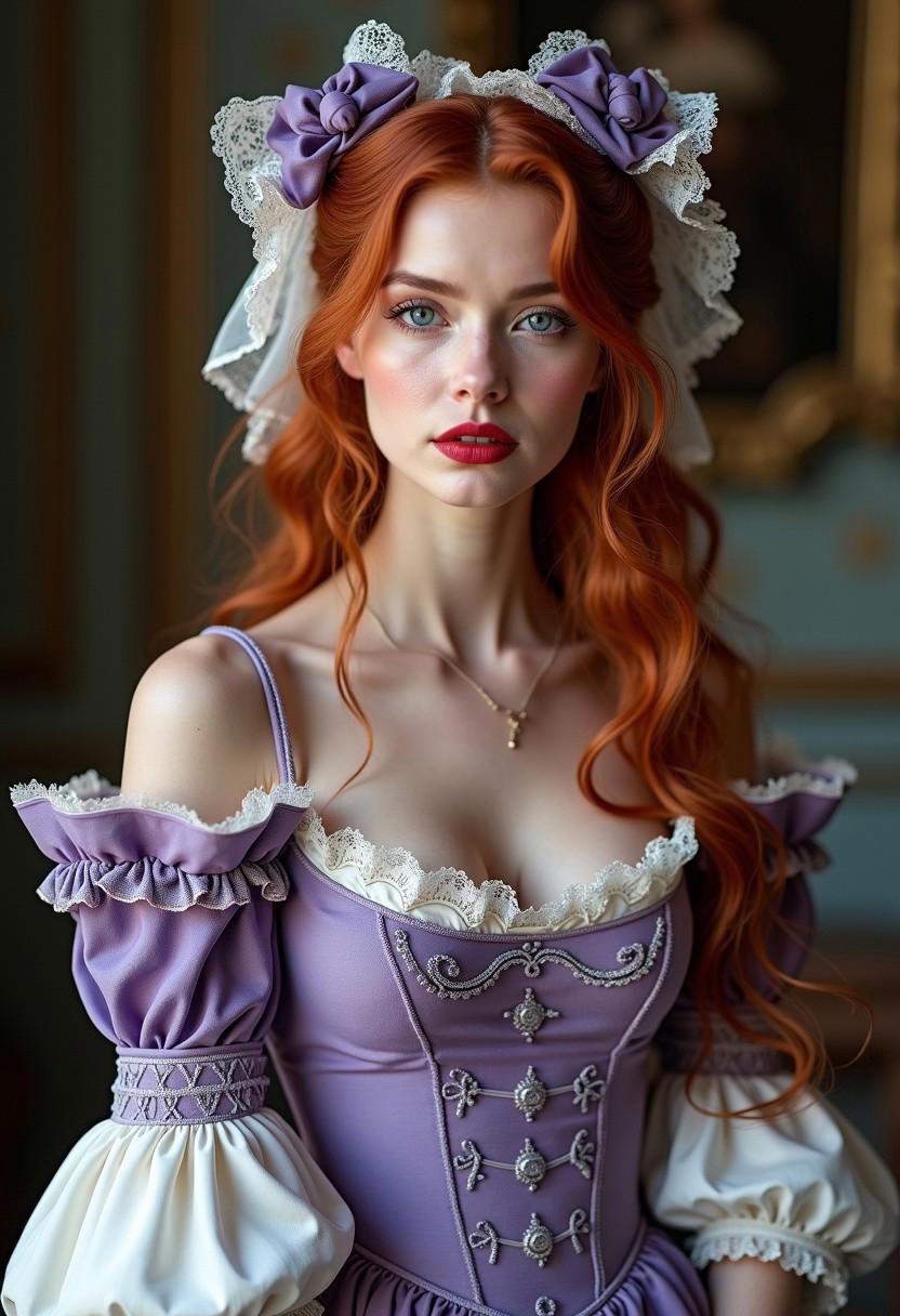 Generate hyper realistic image of a full-body 35mm film photograph of a young redhead woman with slim body dressed in an elaborate violet and white historical-style gown, featuring a fitted bodice with intricate patterns, a flowing skirt, white pantyhose and black high heels. She has long, wavy hair adorned with a large, decorative bow and lace accents, enhancing her vintage aesthetic. Her makeup is polished, highlighting her striking features and bold red lips. The background is softly blurred, emphasizing her presence. realistic skin, natural pores, soft lighting, freckles, wrinkles, human skin details