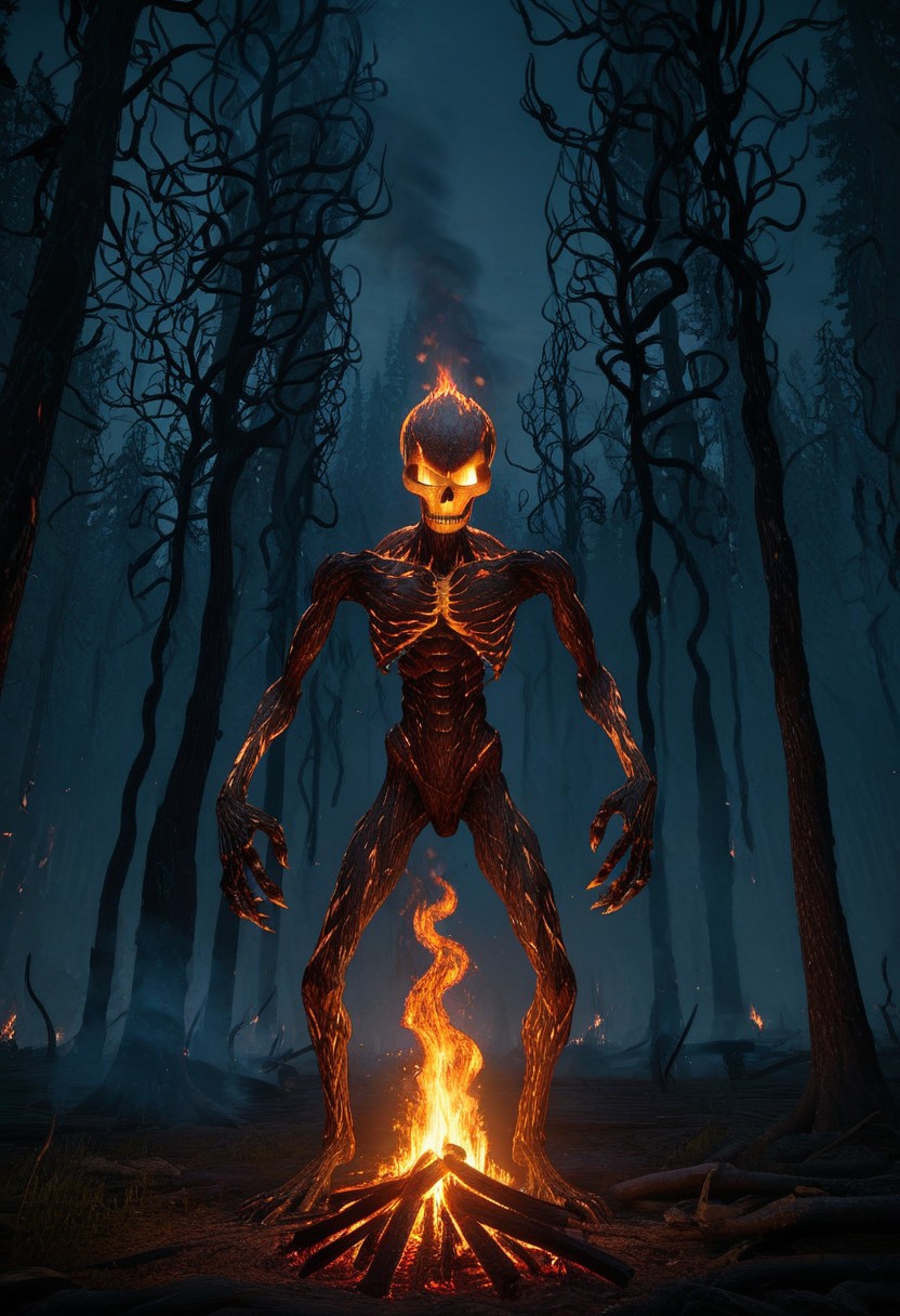 HavvoricFireDarkstyle, masterpiece, High Details, High Quality, HD, kodama on fire, burning forest in the background dark, night, giant, angry