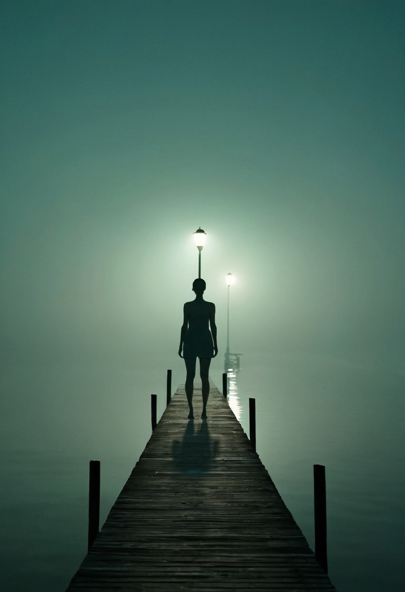 A cinematic nighttime photograph captures a solitary figure standing in silhouette on a wooden pier, accompanied by a single illuminated lamp post. The scene is enveloped in a misty teal atmosphere where sky and water merge imperceptibly. The composition emphasizes minimalism and mood through its use of negative space, cool color palette, and the strategic placement of the human figure and light source. A wooden ladder attached to the pier adds subtle architectural detail to the otherwise simple structure. The entire scene is reflected in the perfectly still water below, creating a mirror-like symmetry that enhances the atmospheric quality of the image.