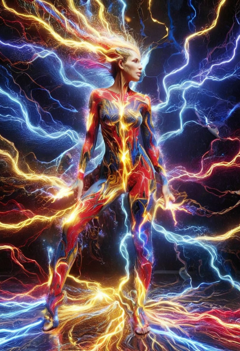 A candid photo of a female model made of golden and blue and red and yellow and purple lightning thunder trails