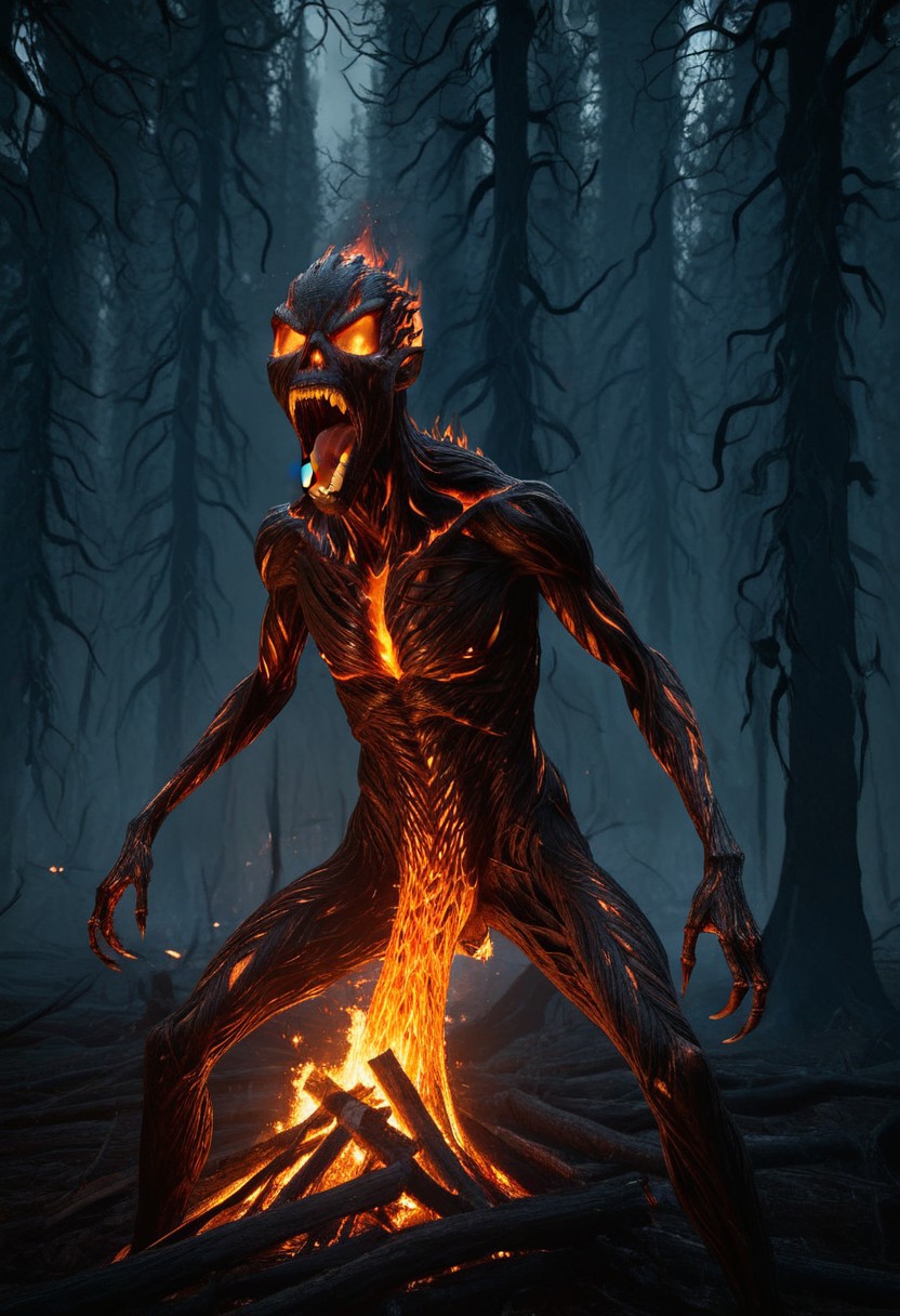 HavvoricFireDarkstyle, masterpiece, High Details, High Quality, HD, dark creature, screaming, covered in fire, dark forest
