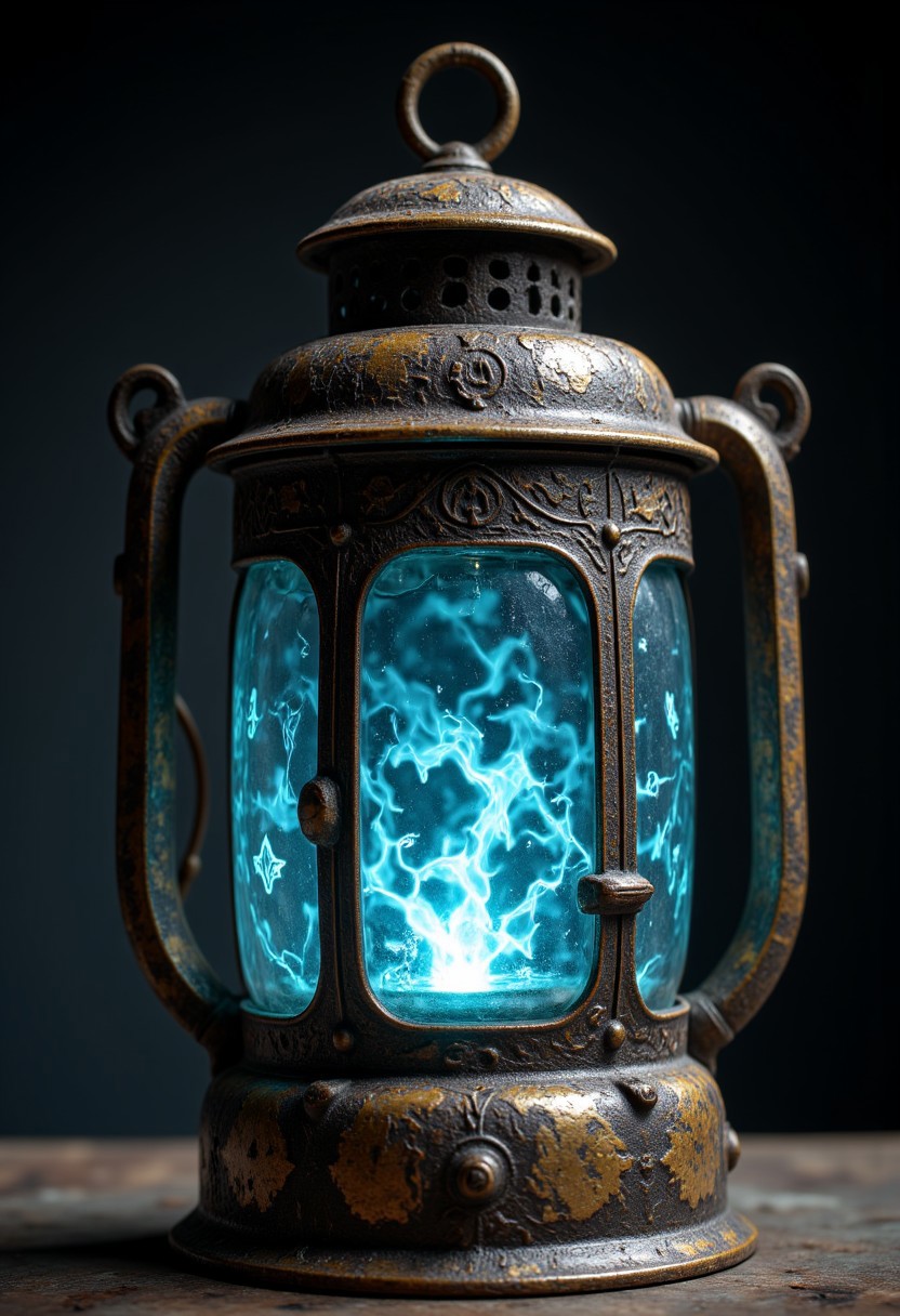 A lantern of tarnished brass, its glass panels etched with arcane sigils that flicker with faint blue light. The handle is wrapped in leather, worn smooth from centuries of gripping hands. Inside, instead of a flame, a swirling mist churns, shifting between shapes—sometimes faces, sometimes landscapes, sometimes unrecognizable figures. The mist never dissipates, and when the lantern is shaken, it seems to momentarily reveal glimpses of forgotten places. , aidmamjv7, aidmaHyperrealism, aidmaimageupgrader