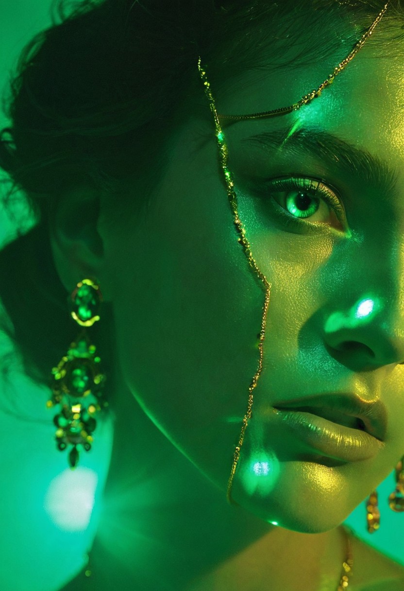 A close-up beauty shot for Vogue Italia, featuring a model with luminous skin adorned with layered gold and emerald jewelry. She gazes directly at the camera with an enigmatic expression, the image awash in a soft, diffused emerald green light that casts an ethereal glow. Her hair, styled in sleek waves, partially obscures her face, creating a sense of mystery. The jewelry, a blend of modern and antique pieces, reflects the green light, adding depth and intrigue to the composition.