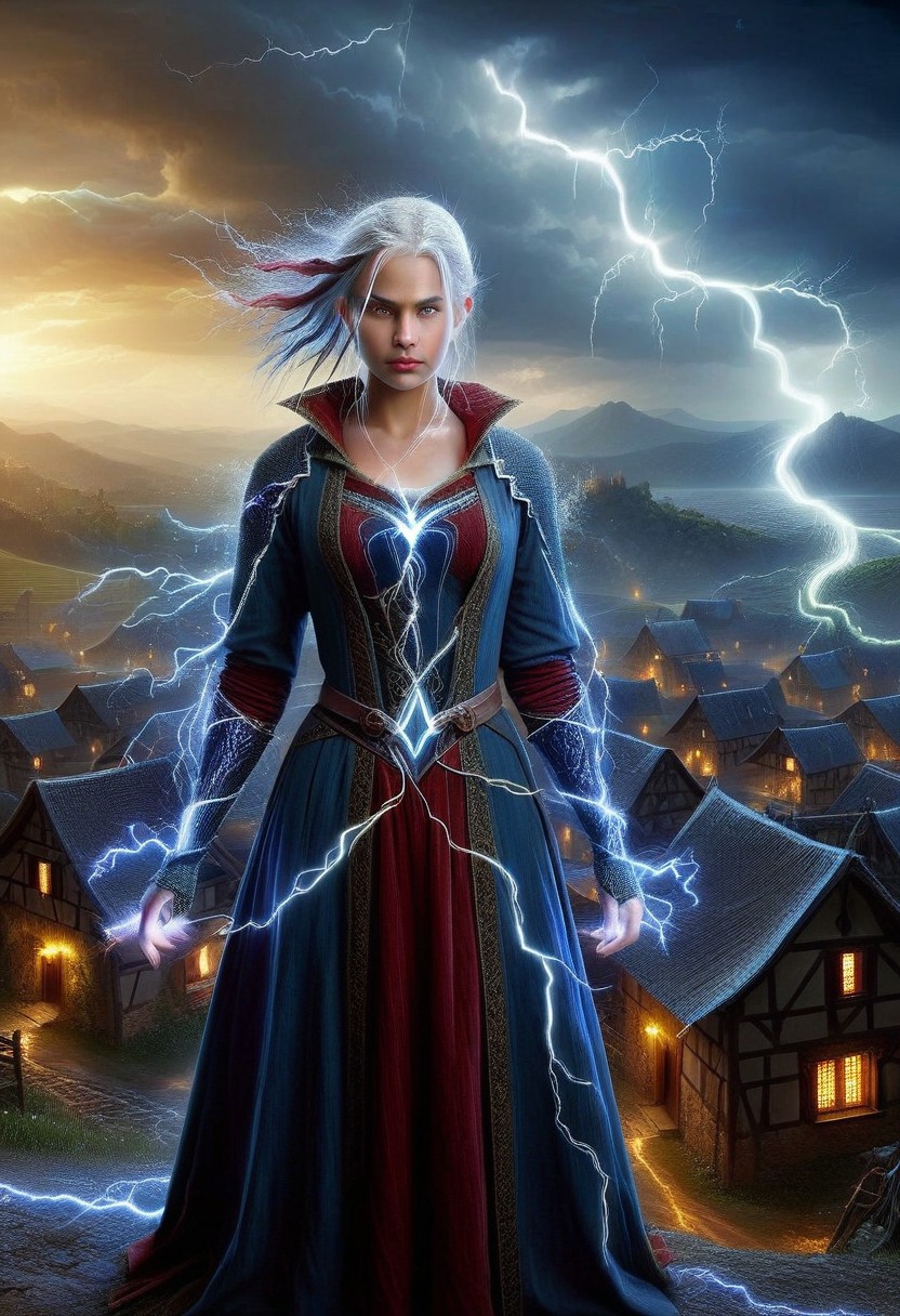 lthndrtrl, masterpiece, High Details, High Quality, woman, medieval village clothing, thunder powers, lightning, village in the background, evil