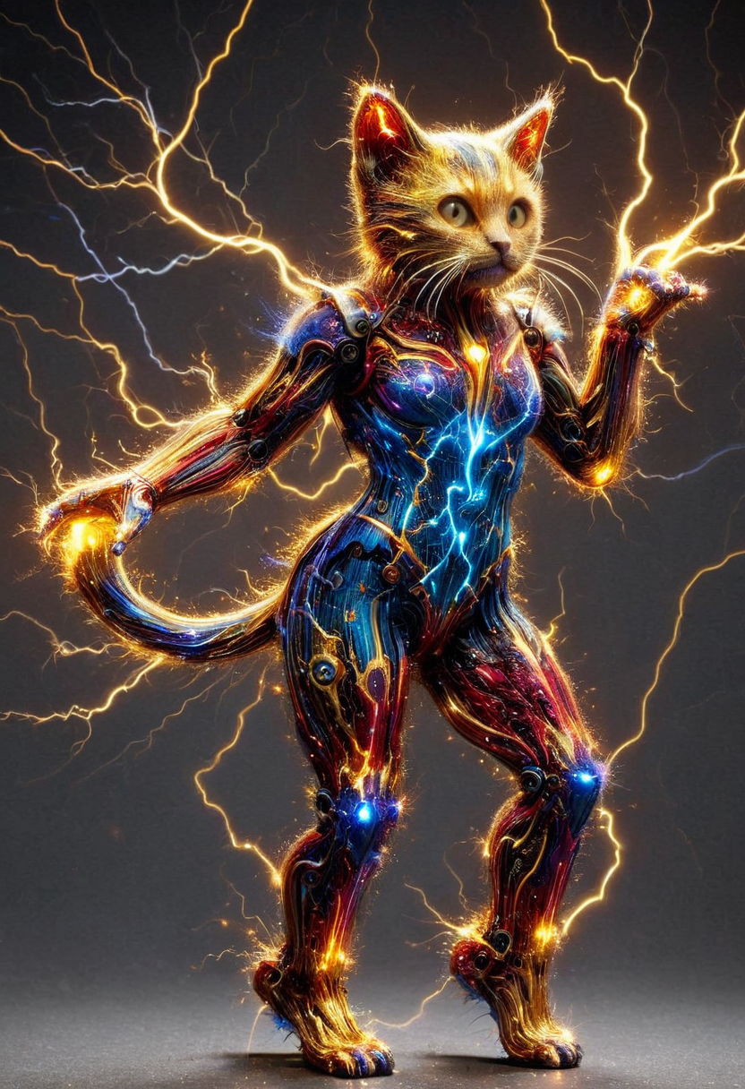 lazypos, highly detailed whimsical standing bipedal humanoid robotic mecha kitten made of golden and blue and red and yellow and purple lightning thunder trails