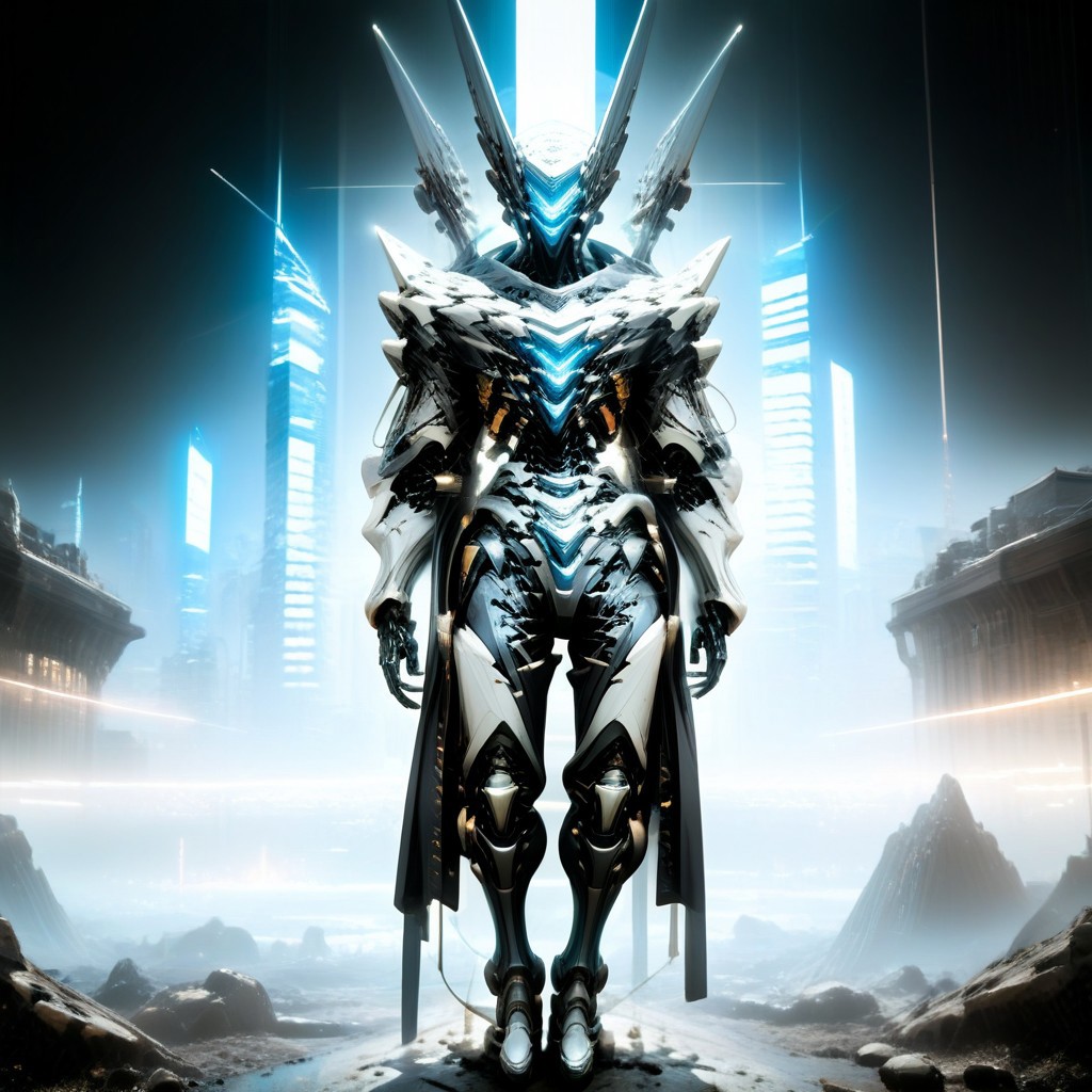 masterpiece, best quality, amazing quality, very aesthetic, perfect eyes, Sinozick_illu, crestyle, Sinozick_illu, gr4ph1t3, ,solo, blue_eyes, no_humans, night, glowing, robot, building, mecha, glowing_eyes, science_fiction, city, cable, open_hands, humanoid_robot,A highly detailed, realistic CGI image of a futuristic, sci-fi robot with a sleek, metallic body and glowing blue eyes. The robot stands confidently on a rocky surface, facing the viewer. The background features a night cityscape with tall buildings and a tall tower. The sky is filled with stars, and the robot has a metallic sheen. The image has a watermark in the bottom right corner that reads "AR17.3". The overall aesthetic is dark and moody.