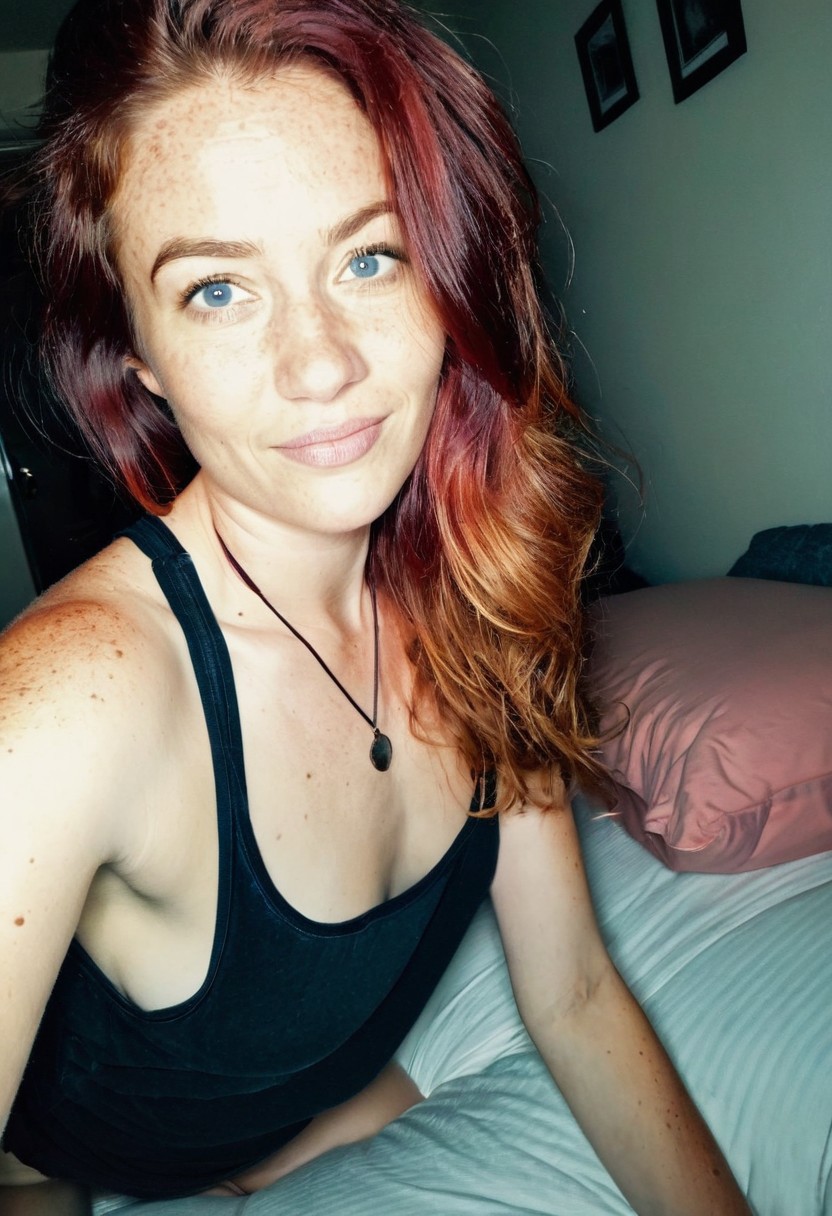 ((amateur photo of an average natural girl)), polaroid picture,frames picture, amateur analog photo, candid photo, Authentic share, (amateur photoshot), grainy picture,(perfect face, perfect eyes details, perfect pupils),realistic skin, goosebump,(((dimlight:1.5))), (((chiarroscuro))), ((fade colors:1.2)), amateur photoshot, medium wide shot, amateur clumsy pose on bed, (((average girl:1.3))),(pendant tiny breast half-visible under loose tank top:1.3), 1 skinny woman, 38 years old,blue eyes, clumsy pose on her bed, dutch angle, (((seductive girl:1.5))), skinny, cute woman, red gradient brown hair, pale skin,pink coton sports short, (black loose tank top),medium shot,freckles, bedroom, dim light, smirk, closed mouth, thin lips,