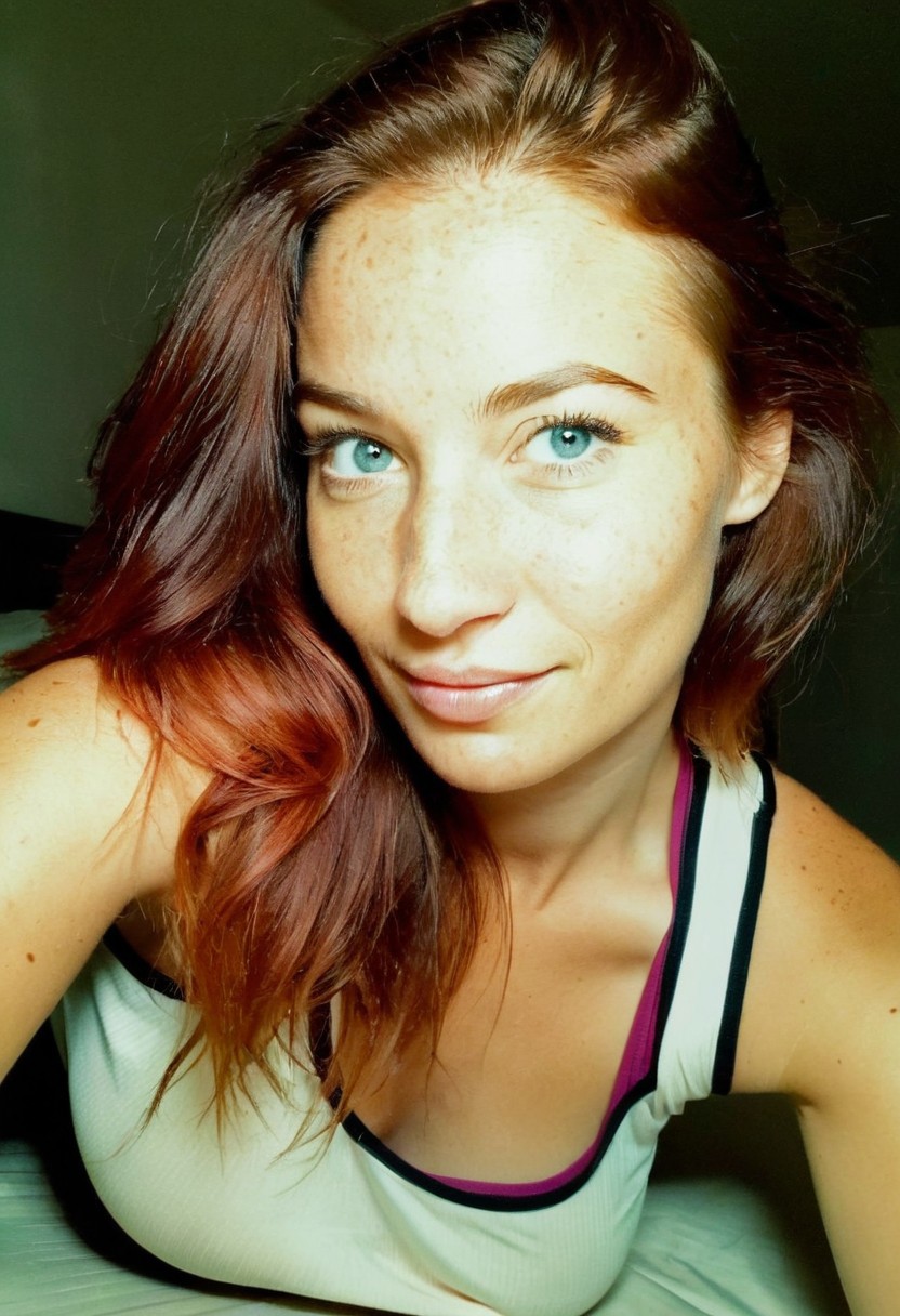 ((amateur photo of an average natural girl)), polaroid picture,frames picture, amateur analog photo, candid photo, Authentic share, (amateur photoshot), grainy picture,(perfect face, perfect eyes details, perfect pupils),realistic skin, goosebump,(((dimlight:1.5))), (((chiarroscuro))), ((fade colors:1.2)), amateur photoshot, amateur clumsy pose on bed, (((average girl:1.3))),bra visible under loose tank top:1.3, 1 skinny woman, 38 years old,blue eyes, clumsy pose on her bed, dutch angle, (((seductive girl:1.5))), skinny, cute woman, red gradient brown hair, pale skin,pink coton sports short, (black loose tank top),medium shot,freckles, bedroom, dim light, smirk, closed mouth, thin lips,