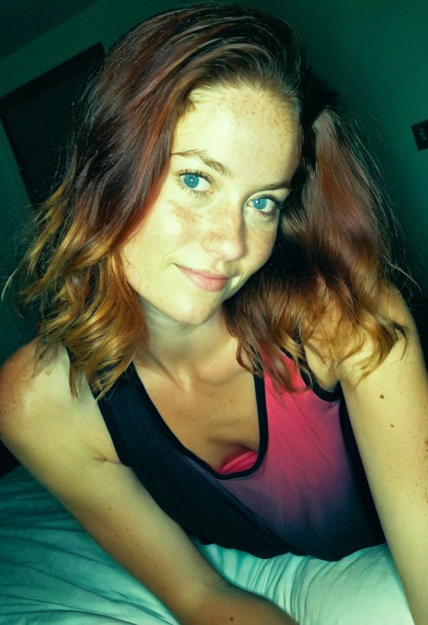 ((amateur photo of an average natural girl)), polaroid picture,frames picture, amateur analog photo, candid photo, Authentic share, (amateur photoshot), grainy picture,(perfect face, perfect eyes details, perfect pupils),realistic skin, goosebump,(((dimlight:1.5))), (((chiarroscuro))), ((fade colors:1.2)), amateur photoshot, amateur clumsy pose on bed, (((average girl:1.3))), 1 skinny woman, 38 years old,blue eyes, clumsy pose on her bed, dutch angle, (((seductive girl:1.5))), skinny, cute woman, red gradient brown hair, pale skin,pink coton sports short, (black loose tank top),medium shot,freckles, bedroom, dim light, smirk, closed mouth, thin lips,