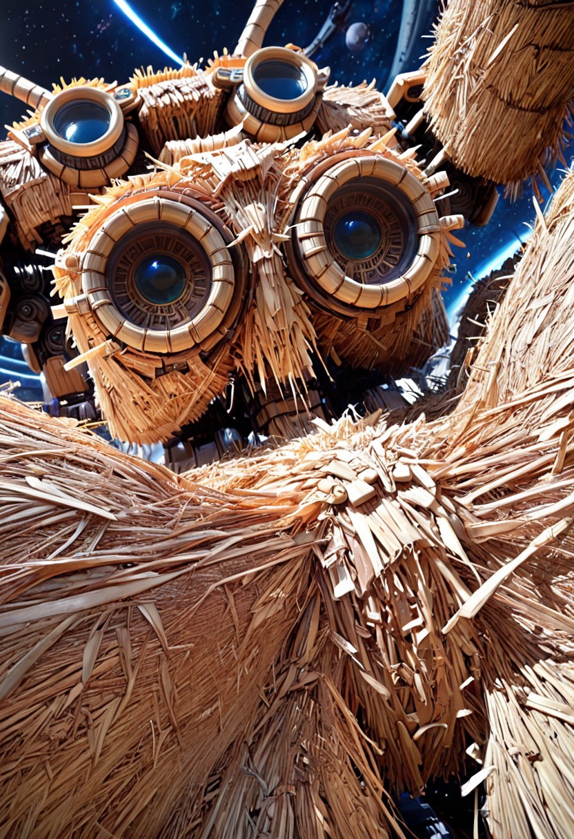 (made of straw:1.3), closeup huge mecha Straw robot, wear round goggles, from below, in space planet ground, closeup shot, cinematic, cinematic lighting, (masterpiece, best quality:1.4), ultra-high res, 4k, insanely detailed, sfw,