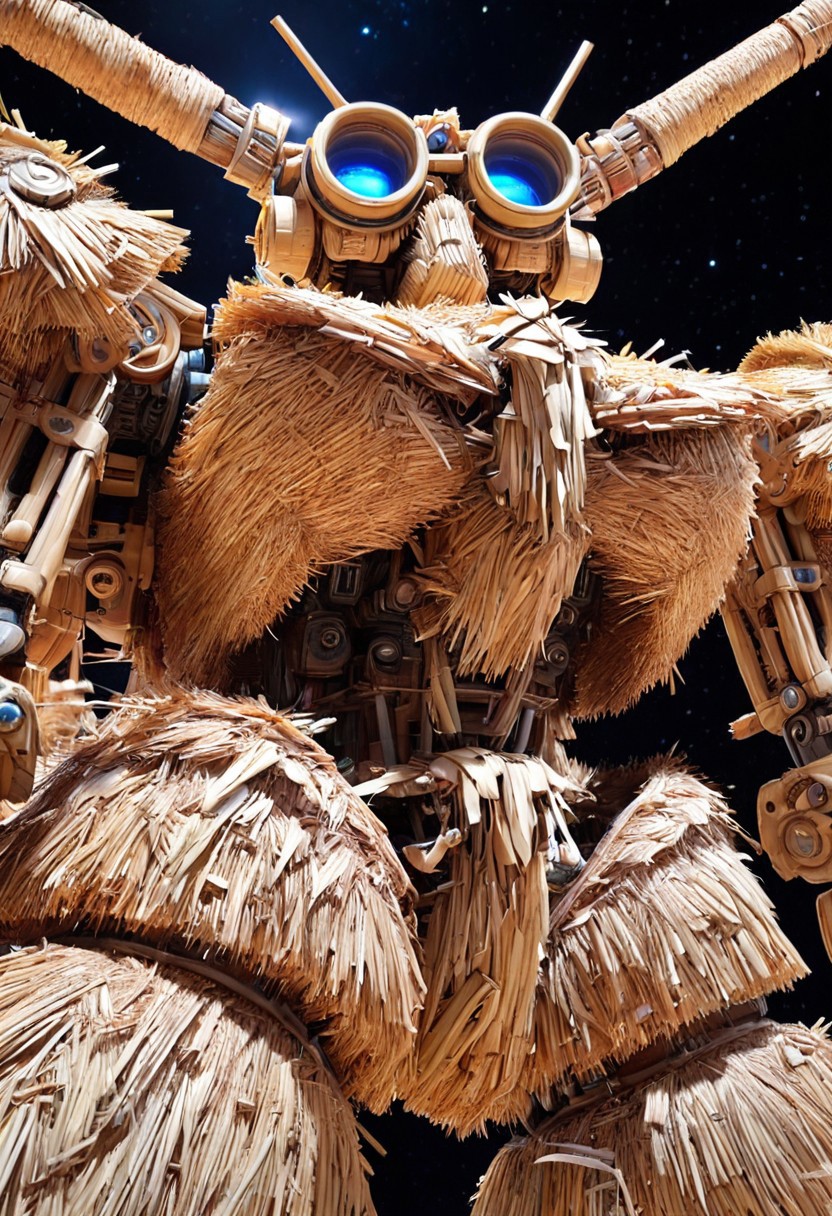 (made of straw:1.3), closeup huge mecha Straw robot, wear round goggles, from below, in space planet ground, closeup shot, cinematic, cinematic lighting, (masterpiece, best quality:1.4), ultra-high res, 4k, insanely detailed, sfw,