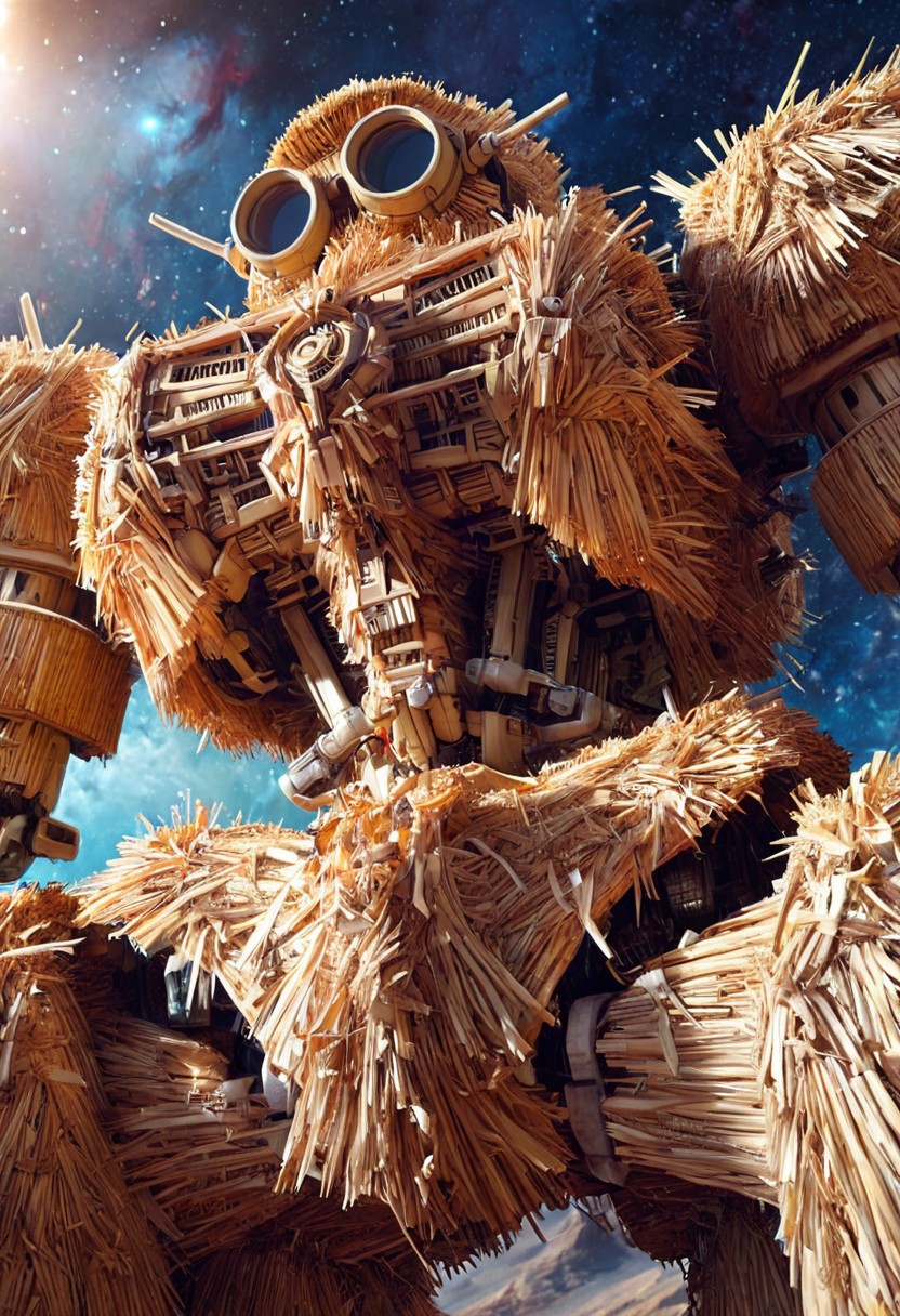 (made of straw:1.3), closeup huge mecha Straw robot, wear round goggles, from below, in space planet ground, closeup shot, cinematic, cinematic lighting, (masterpiece, best quality:1.4), ultra-high res, 4k, insanely detailed, sfw,