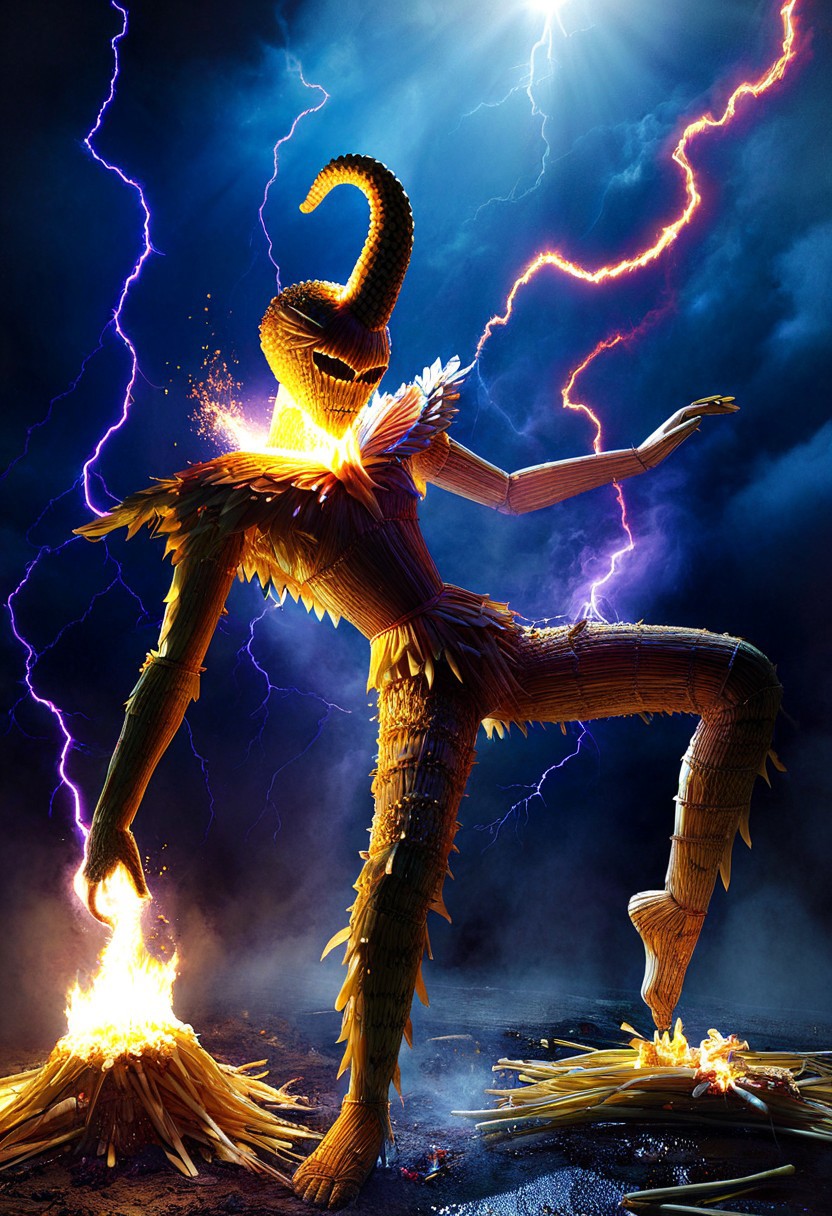 Straw-man, made of straw, humanoid corn, surrounded by melted butter, dancing on fire, fire, embers, scared, fear, violently, intense, moody, epic, epic, majestic, fantasy, dreamy, perspective, moody, magical, light and shadow, religious, mythological themes, magnificent, celestial, ethereal, concept-art, adventure, characters, fantasy, whimsy, dreaminess, colorful, digital, illustration, magic, beautiful, painterly, detailed, textural, artistic, aesthetic, rich details, intricate details, highly detailed, ultra-detailed, absurdres, vivid, vibrant, volumetric lighting, aid291, midjourneyv6.1, made of golden and blue and red and yellow and purple lightning thunder trails, lthndrtrl