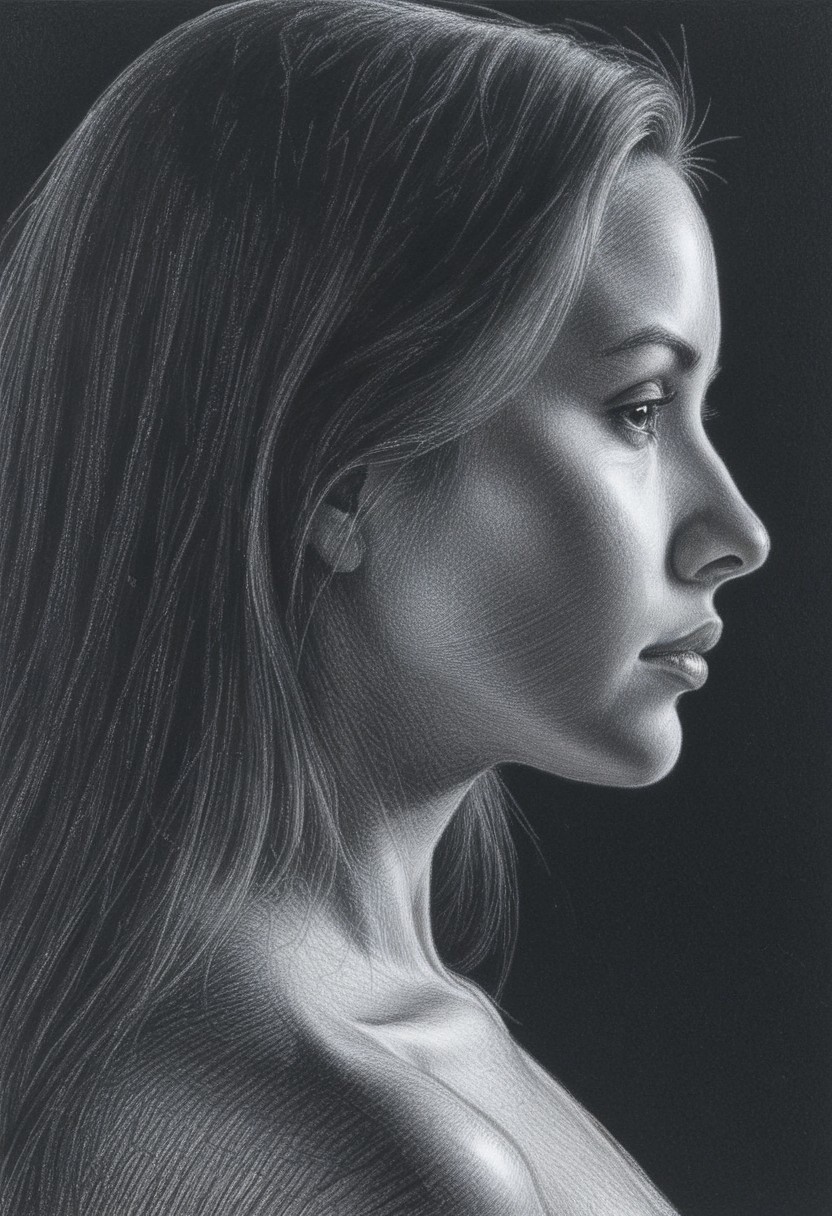 monochrome, noc-wfhlgr, 1girl, solo, portrait, long hair,close-up, focus on face, natural skin, small breast, nipple, natural breast, from side Charcoal drawing, black pencil drawing, pencil drawing, black and white drawing, graphite drawing, dark background