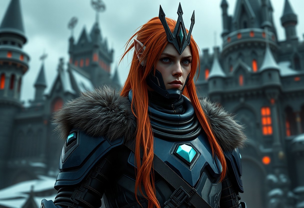A highly detailed, lifelike depiction of a Cyber Soldier from Darkworld, adorned in navy blue armor and adorned with fur shoulder pads, standing in front of a Castle of Dark Illusions. The soldier, with long red-orange hair and a light grey crown, draws inspiration from Samuel F.B. Morse and Mór Than. The artwork is designed for a game, following the golden ratio and showcasing terracotta shaders. Created with Octane Render, it embodies the styles of H.R. Giger, Charles Marion Russell, and Simon Stalenhag, aiming to trend on ArtStation.