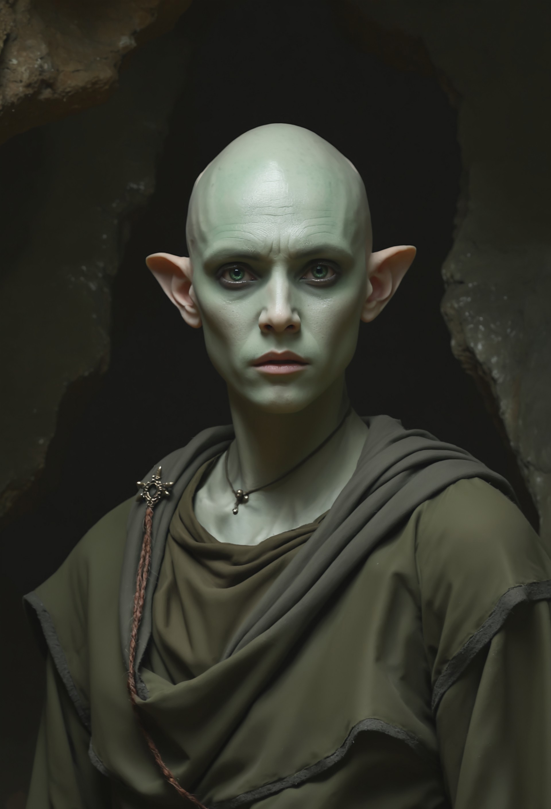 Androgynous bald bipedal human with no ears and scaled skin standing in cave, wearing simple medieval clothing, grey skin, , green skin, , detailed eyes,