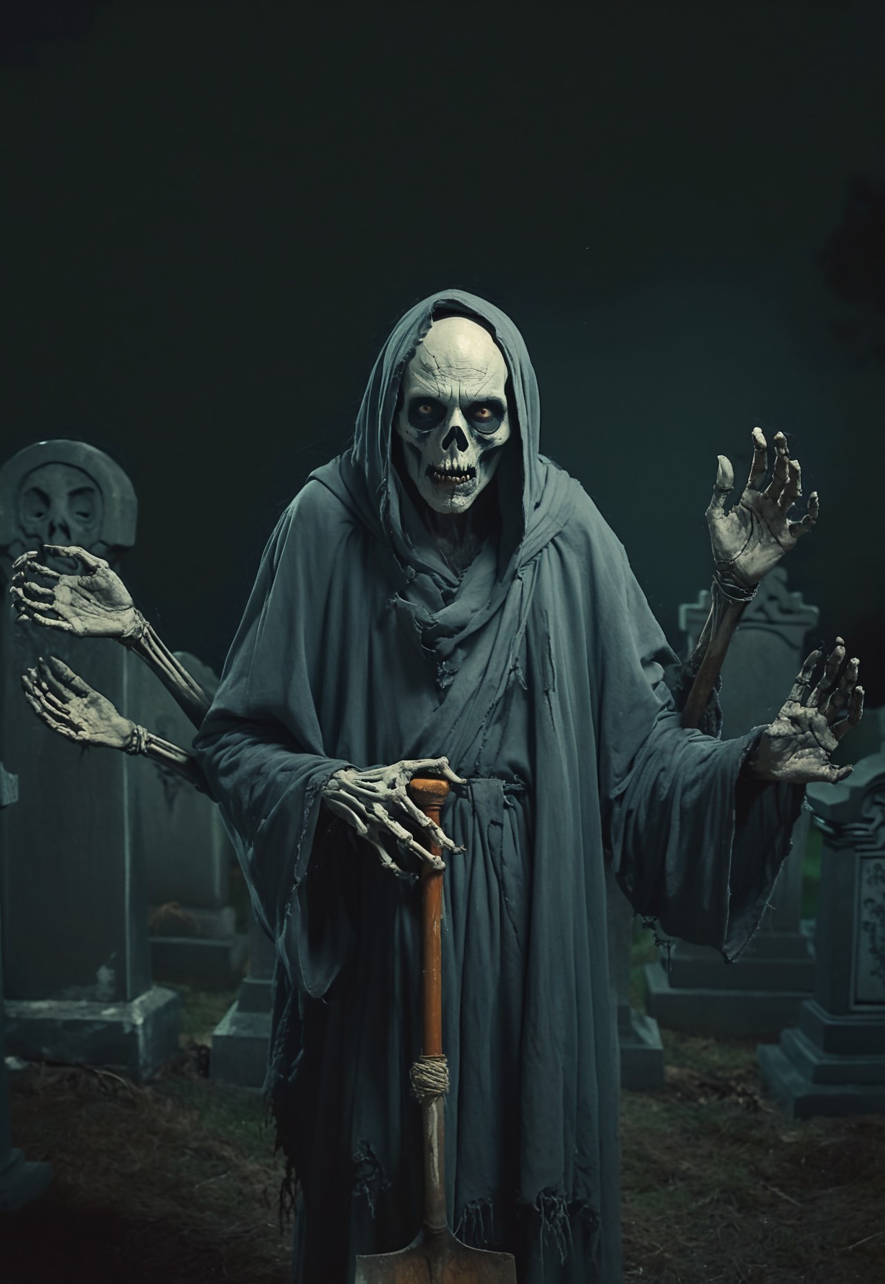 Incredibly thin old man in tattered grey robes with multiple arms standing in graveyard at night. Skeleton face paint, dark eyes, large nose, holding shovel, flash photo, horror, night time, full body photo, hooded, large incredibly detailed eyes, full body