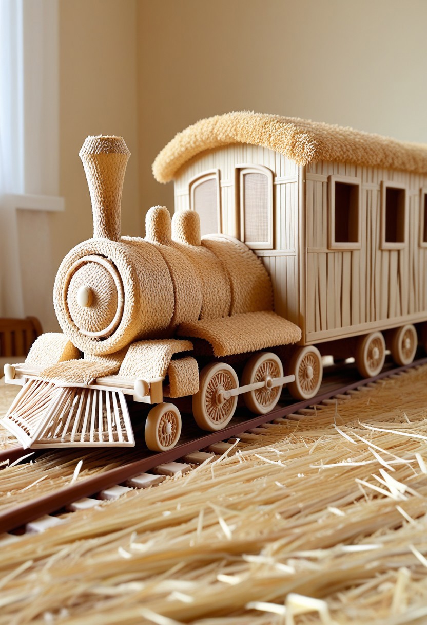 Masterpiece, High Details, High Quality, HD, toy train, Made of straw, indoors, bedroom on background