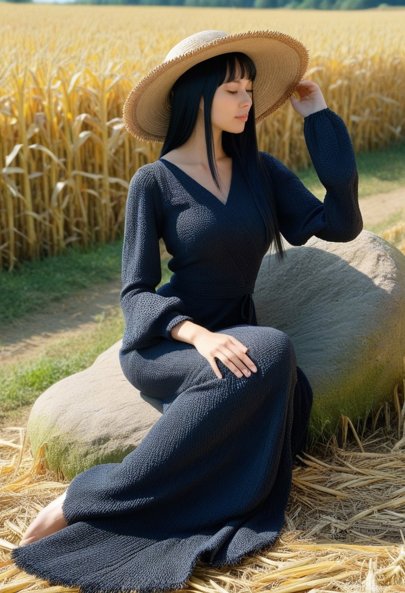 Masterpiece, High Details, High Quality, HD, woman, black hair, long dress, Made of straw, sleeves, straw hat, outdoors, sitting on rock, cornfield on background