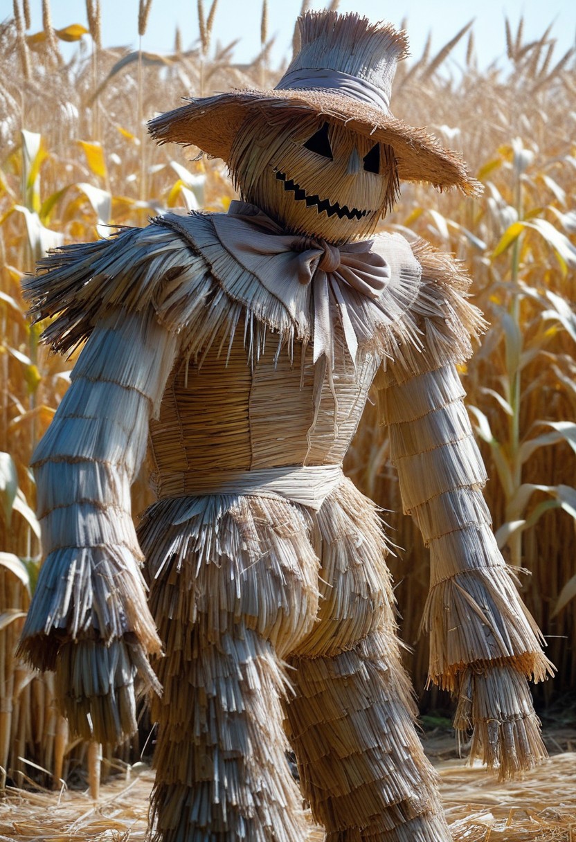 Masterpiece, High Details, High Quality, HD, scarecrow, Made of straw, outdoors, cornfield on background