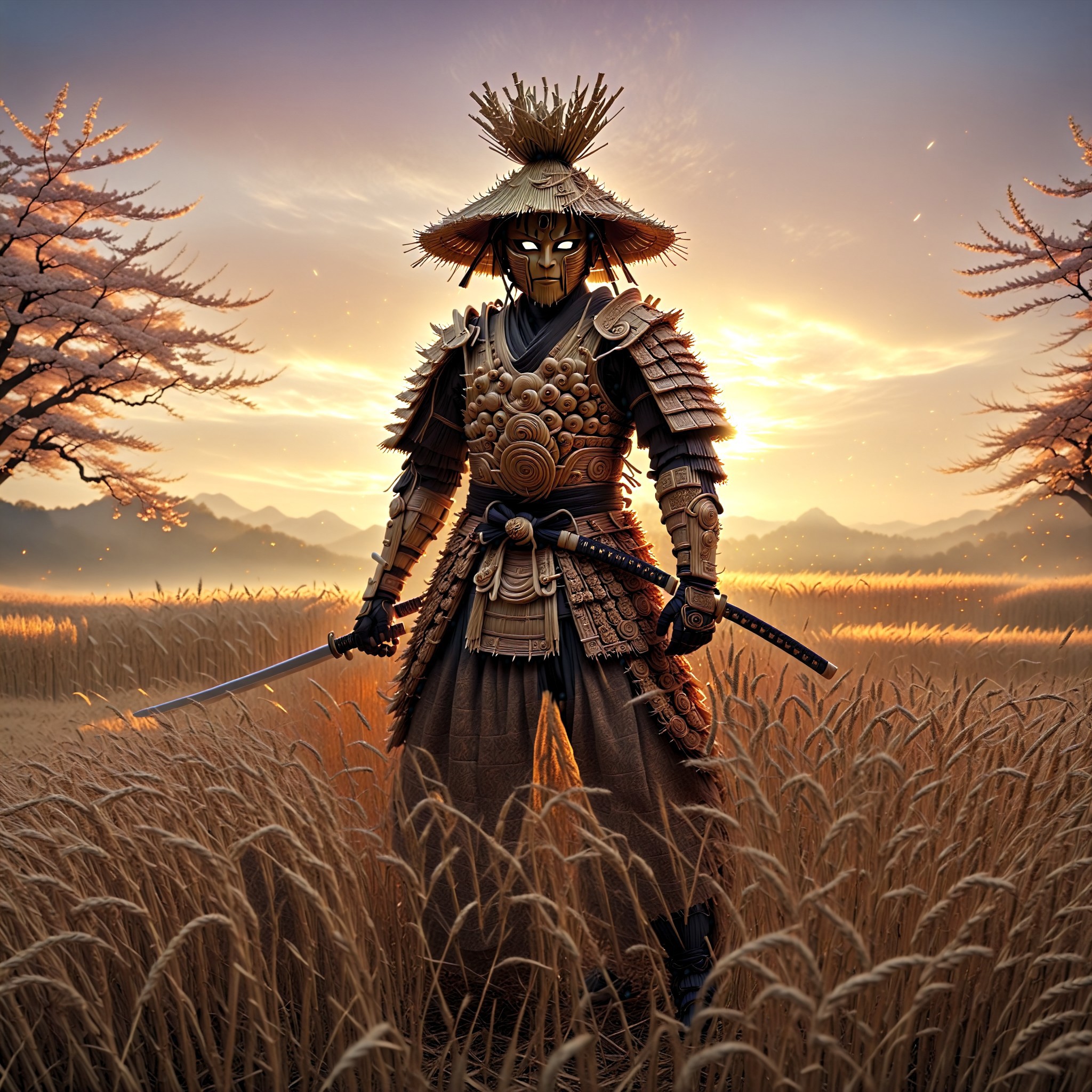 A high-fantasy cinematic portrait of the Hay Samurai — a mystical warrior made of enchanted straw and cloth, standing in a golden field at sunset. His body is woven from tightly bound hay and fabric wraps, and he wears weathered but noble samurai armor etched with glowing natural patterns. His hair is a topknot of straw, and his eyes glow faintly behind a hand-carved wooden mask. He holds a katana forged from golden wheat and sunlight. Cherry blossoms and dust swirl around him in the wind. The scene is peaceful but powerful — a lone warrior of the harvest. Ultra-detailed, warm lighting, earthy tones, fantasy realism, serene but noble energy.