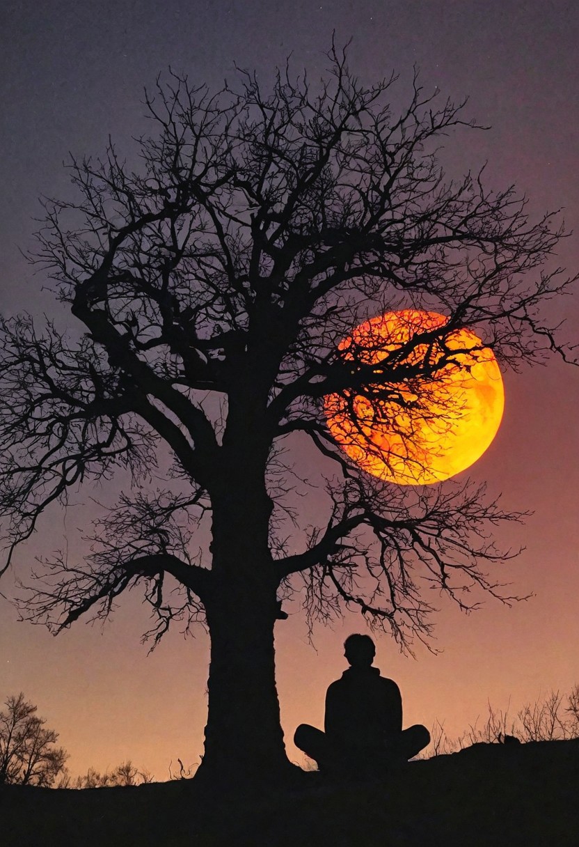 A dramatic sunset photograph featuring a solitary human figure sitting in silhouette at the base of a bare winter tree, centered perfectly against an enormous orange-red moon. The tree's black intricate branch structure creates a detailed lacework pattern across the bright surface of the moon. The composition employs strong backlighting and deep contrast, with the night sky transitioning from dark navy blue tones at the top to warm orange hues near the horizon line where the figure and tree are silhouetted. The human figure sits cross-legged directly beneath the tree's trunk, their form rendered completely in black against the luminous backdrop. Dramatic landscape photography with strong backlighting and deep contrast between dark silhouettes and bright light sources.