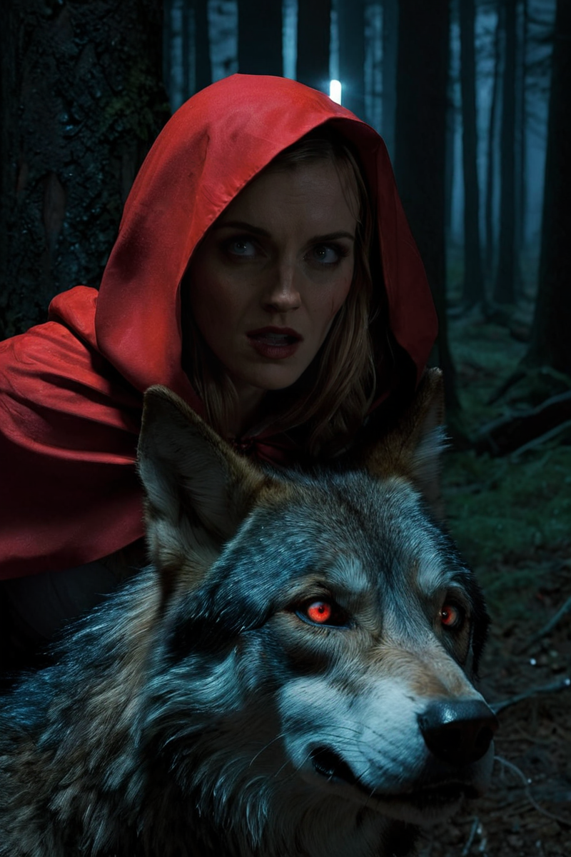 <lora:Emma_Watson_SDXL_101_v_epic:1> emmswatons101vepic ,cinematic of red riding hood with a wolf in the dark black forest at night, ,flashlight shining on her face finely detailed eyes, epic scene, , photo realistic