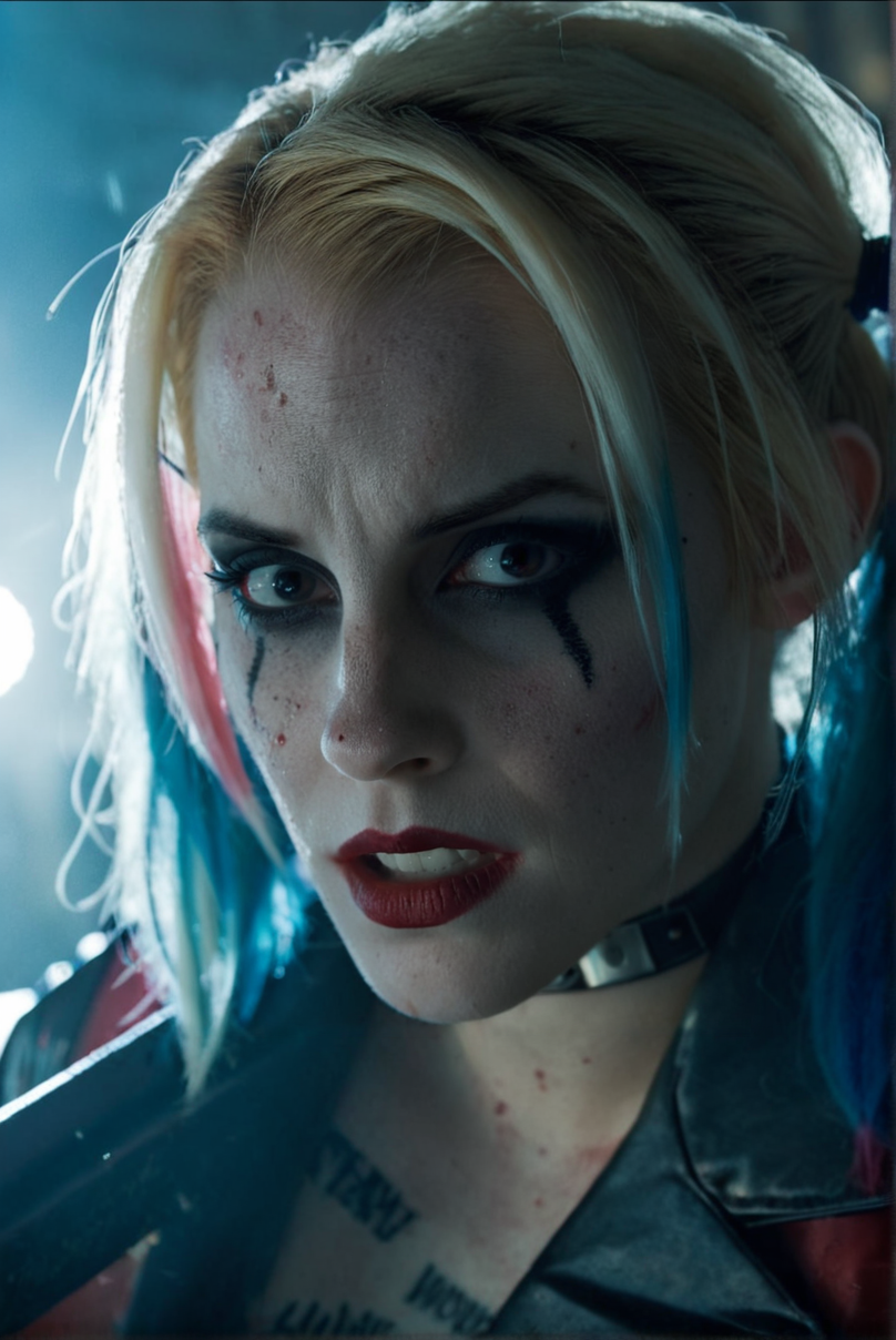 <lora:Emma_Watson_SDXL_101_v_epic:0.85> emmswatons101vepic 1girl cinematic photo Close-up Harley Quinn , angry expression, dirty face, finely detailed eyes, moody, comic clothes, epic scene, epic composition, Photography, Cinematic Lighting, Volumetric Lighting, ethereal light, intricate details, extremely detailed volumetric rays 35mm photograph, film, bokeh, professional, 4k, highly detailed . Eerie, unsettling, dark, spooky, suspenseful, grim, highly detailed