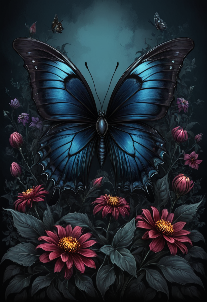 butterfly, flowers, dark colors, hand draw, gothic style, dark fanatsy art, digital painting, mobe-godeen <lora:GothicDetailEnhancerV1:0.5>,