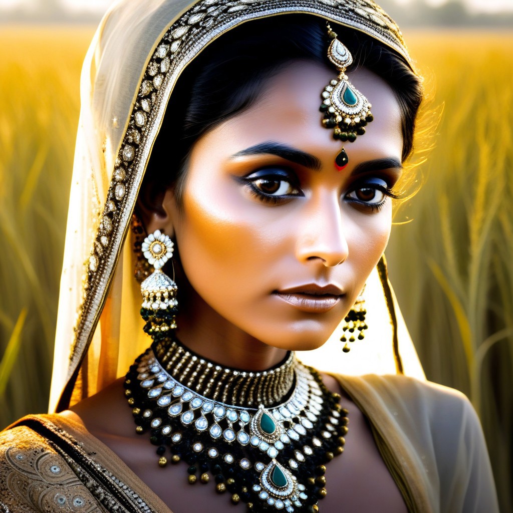 A close-up scene of an Indian woman’s face and neck, her brown Rajasthani skin glowing with a soft, oily, glossy sheen under golden light. She wears a transparent, intricate golden veil draped over her head, detailed like fine lace, shimmering with delicate patterns. Her black eyes are deep and calm, framed with sharp black eyeliner extending elegantly. Her lips are full, painted rich red, contrasting her luminous skin. Traditional Rajasthani clothing wraps her neck and shoulders, adorned with sparkling gold ornaments — layered necklaces, ornate earrings, and forehead jewelry, each piece reflecting warm light with detailed craftsmanship. A soft white cotton flower rests within the frame near her neck, its texture delicate against the brilliance of her jewelry. Behind her, the background stretches into a blurred wheat paddy, golden fields swaying softly, merging with the sunlit atmosphere. The scene radiates timeless beauty, nature, and the regal grace of Rajasthani tradition.