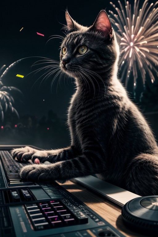 (masterpiece:1.2), (best quality:1.2), highly detailed, realistic texture, sharp details, extremely delicate and beautiful, realistic cg 8k wallpaper Cat DJ with RGB paws, spinning tunes with keyboards, confetti and fireworks, Dark, Moody, Volumetric light, backlight, wearing sunglasses, <lora:add-detail-xl:3> <lora:RGB_Keyboard_themed:1>