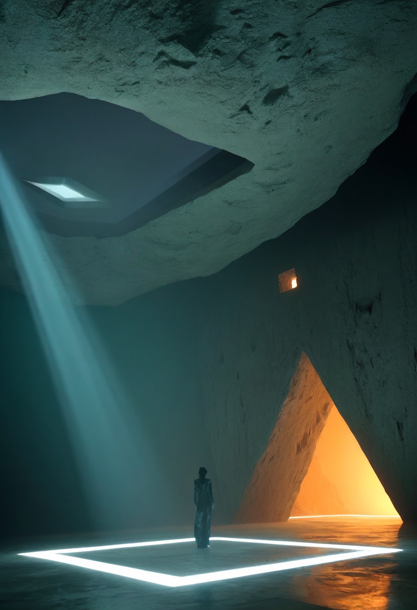 A science fiction scene depicts a vast underground chamber dominated by a massive diamond-shaped window structure with geometric triangle-pattern beams, emitting bright white light from above. The chamber features rough, curved cave walls contrasting with the architectural precision of the window. A solitary silhouetted figure stands centered on a reflective floor surface, while warm orange-lit posts line a path through the space. The scene is rendered in photorealistic with volumetric lighting effects, creating a dramatic atmosphere through the interplay of natural and artificial elements. bright white LED strips that create a geometric pattern against the dark teal sky. Dense fog permeates the scene, partially obscuring a distant building with lit windows. Dark silhouettes of trees frame the composition, while the cool color palette and artificial lighting create a moody, noir atmosphere.