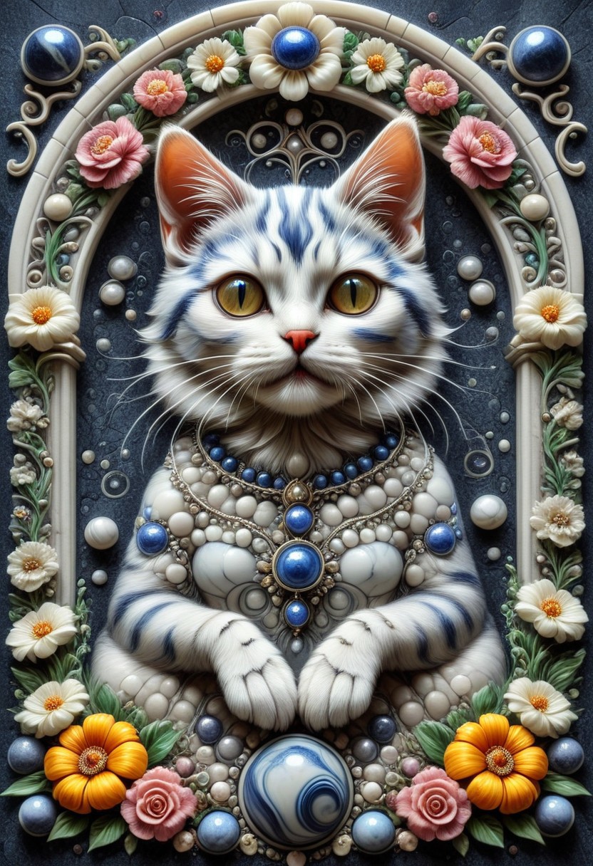 a illustration of a cat as a wall emblem made with marbles, flowers around, gothic style, mobe-godeen