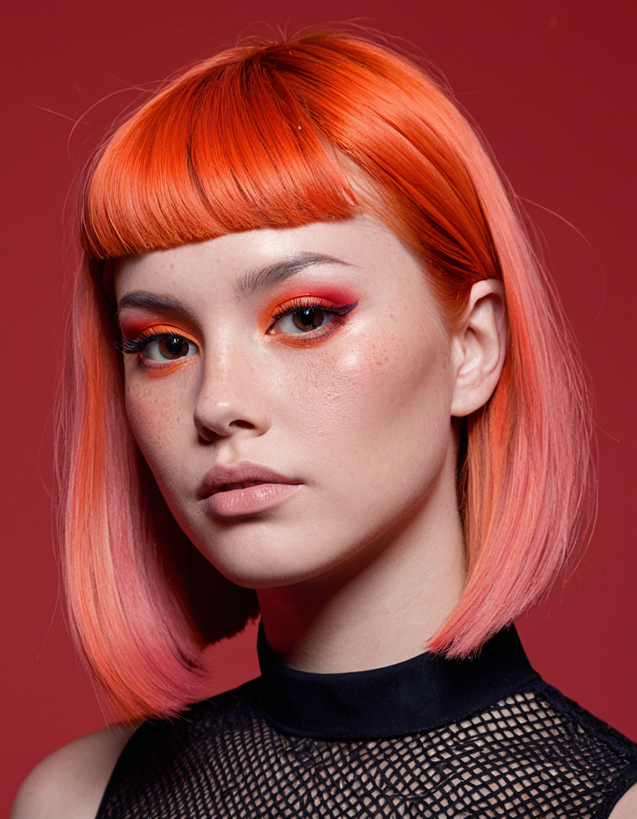 A hyperrealistic, high-fashion studio portrait of a woman with striking features and avant-garde styling, set against a vibrant solid background. The image is captured with the sharpness and clarity typical of a professional portrait lens, such as a NIKKOR Z 85mm f/1.2 S, delivering an ultra-sharp, captivating subject against a clean, bold backdrop, emphasizing a modern, editorial aesthetic. High saturation enhances the vivid color palette. Character & Face (Highly Detailed): Subject: A young woman, possibly of East Asian or mixed heritage, with a light, smooth complexion, positioned facing slightly off-center but looking towards the camera (three-quarter view). Expression: She holds a direct, confident, and intense gaze, exuding a cool, modern, and slightly edgy attitude. Eyes: Dark brown, almond-shaped eyes looking directly at the camera, with sharp, clear catchlights reflecting the studio lighting. Makeup features dramatic, blended orange/red eyeshadow extending outwards and sharp, black winged eyeliner. Eyebrows: Dark, well-defined, and neatly shaped, contrasting with her light pink hair. Nose: Straight and well-proportioned, with subtle, natural-looking freckles visible across the bridge. Cheeks & Jawline: Defined cheekbones are adorned with a unique, striking orange/red grid pattern makeup effect, applied precisely under the eyes and across the upper cheeks. Her jawline is sharp and elegant. Skin has a smooth, matte-to-satin finish. Lips: Full lips painted in a bold coral-red shade with a subtle satin finish, slightly parted. Hair: Short, sharp bob haircut ending just below the chin line. The hair is dyed a vibrant, saturated pastel pink. A thick, precisely cut straight fringe (bangs) covers her forehead, ending just above her eyebrows. The texture appears smooth and sleek. Expression & Pose: Her expression is poised and self-assured, holding the viewer's gaze confidently. She stands upright with her head slightly tilted, presenting a strong, fashionable presence. Attire & Accessories: She wears a sleek, high-necked pink dress. The shade of pink perfectly complements her hair, creating a striking monochromatic statement that harmonizes with the red background and makeup accents. The fabric appears smooth, perhaps with a subtle texture or sheen, featuring a clean, modern cut that allows the focus to remain on her face and intricate makeup. The most prominent 'accessories' are the avant-garde makeup elements: the dramatic eye makeup and the intricate grid pattern on her cheeks, which are integral to the overall look. No traditional jewelry is visible. Background & Composition: The scene is set against a plain, seamless, vibrant solid red background. The lack of environmental detail ensures complete focus on the subject. The composition is a medium close-up or bust shot, tightly framed to emphasize her face, hair, and the upper part of her attire. Strong color harmony and contrast exist between the pink hair, pink dress, red background, and red/orange makeup accents. Camera & Lens Details: Captured with professional camera equipment, likely using a prime portrait lens (e.g., 85mm) renowned for exceptional sharpness and clarity, rendering fine details in hair, skin texture, and makeup precisely. Shallow depth of field ensures the subject is tack-sharp while the background remains a flat, uniform color field (bokeh is not applicable here, but subject separation is maximized). Smooth, controlled light falloff across her features. Vivid, highly saturated color reproduction accurately captures the bold hues of the styling. Lighting & Camera Quality: Shot under controlled studio lighting conditions. The light appears soft, even, and likely positioned frontally or slightly off-axis to illuminate her face clearly, minimize harsh shadows, and highlight the intricate makeup and textures. Image quality is exceptionally high, demonstrating sharp focus, fine detail resolution, and a clean, noise-free appearance characteristic of professional fashion or beauty photography. The overall aesthetic is polished, vibrant, and contemporary.