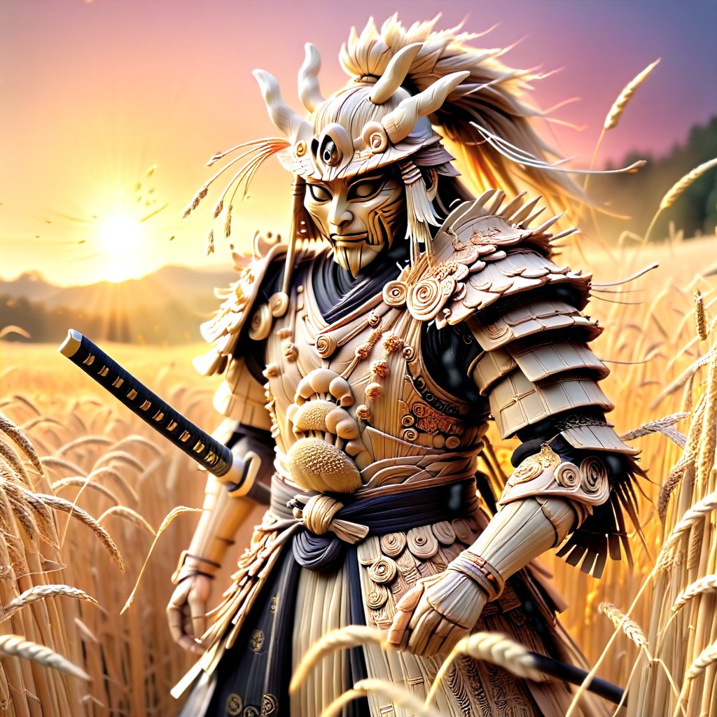 A high-fantasy cinematic portrait of the Hay Samurai — a mystical warrior made of enchanted straw and cloth, standing in a golden field at sunset. His body is woven from tightly bound hay and fabric wraps, and he wears weathered but noble samurai armor etched with glowing natural patterns. His hair is a topknot of straw, and his eyes glow faintly behind a hand-carved wooden mask. He holds a katana forged from golden wheat and sunlight. Cherry blossoms and dust swirl around him in the wind. The scene is peaceful but powerful — a lone warrior of the harvest. Ultra-detailed, warm lighting, earthy tones, fantasy realism, serene but noble energy.