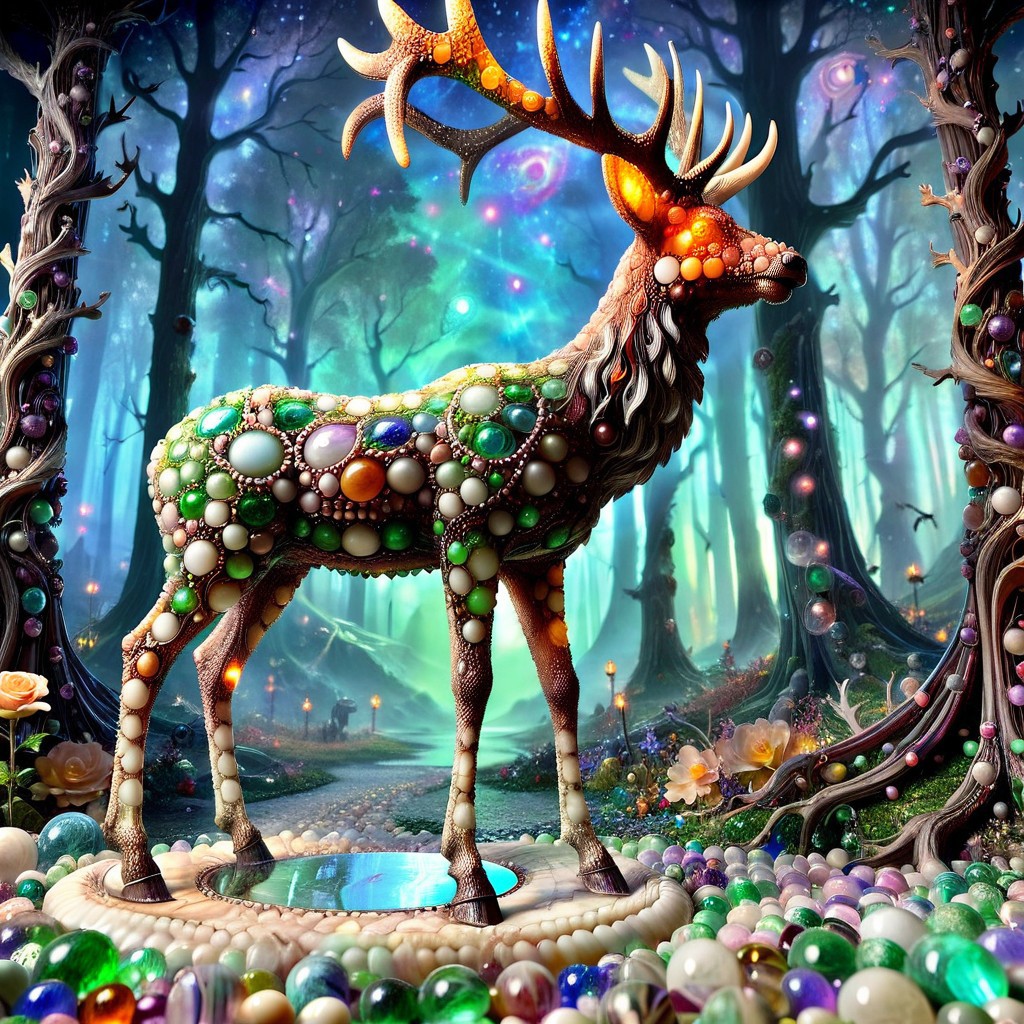 In the heart of a glowing, enchanted forest, a majestic stag stands silently — his entire body composed of thousands of intricately arranged glass marbles. Each marble is unique, glowing softly from within in shades of amber, emerald, moonlight silver, and soft rose. The marbles form the stag’s graceful frame: slender legs, broad chest, elegant neck, and proud head — all a seamless mosaic of light and color. His antlers stretch high and wide, made from delicate marble strands that spiral upward like branches of frozen starlight. Inside the marbles shimmer miniature galaxies, swirling mists, and distant constellations. As he breathes, the marbles softly shift and hum like wind chimes. The forest around him glows in reverent silence — trees with crystal leaves, a soft mist covering the ground, and floating lights dancing like spirits. The entire scene feels sacred, dreamlike, and ancient — a vision from a forgotten fairytale. High fantasy art, extreme detail, glowing effects, magical atmosphere.