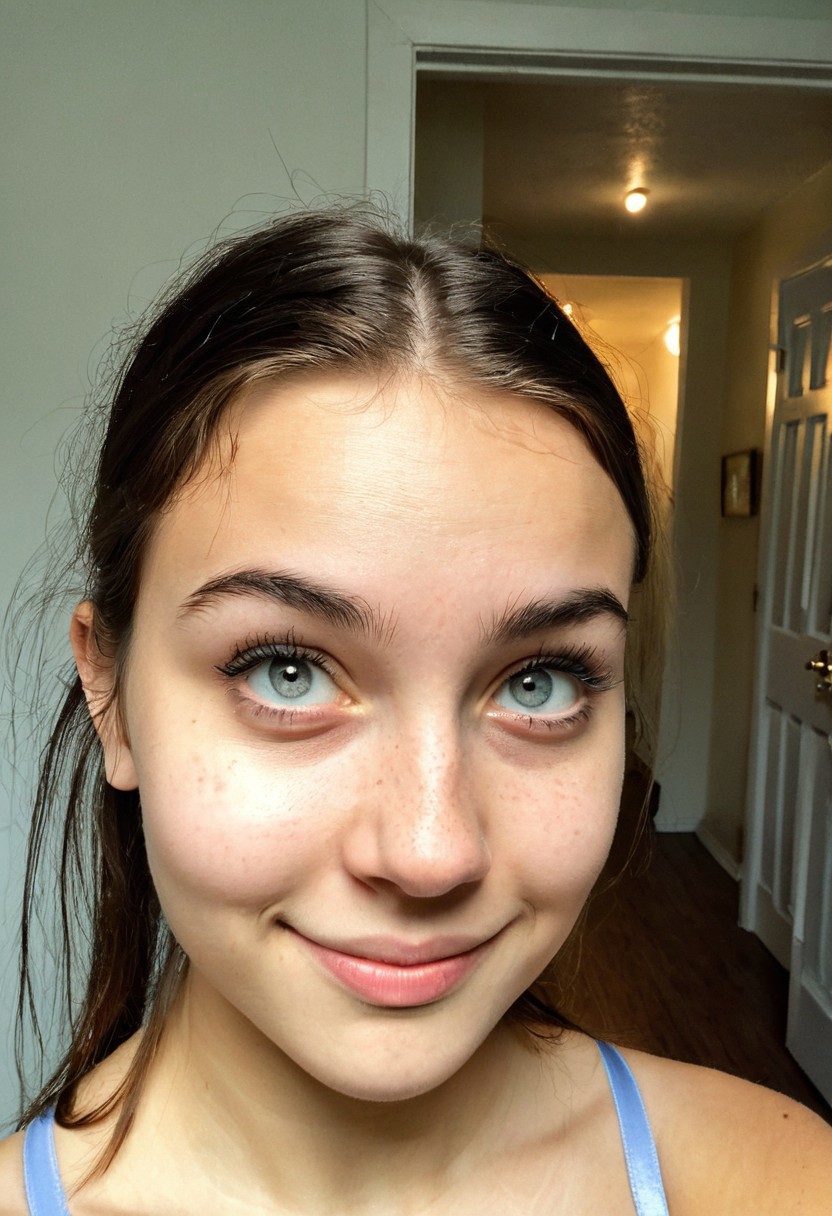 analog film,amateur photography, dim lighting, shadowplay, photo realistic , reality, reflector \(photography\), wide angle. (stunning eyes, detailed iris, cute innocent face). indoor,front view:1.5,doorstep pov, 29 years old, standing front viewer,smirk,90's style haircut, long hair, girl wears,90'style sexy Lingerie,