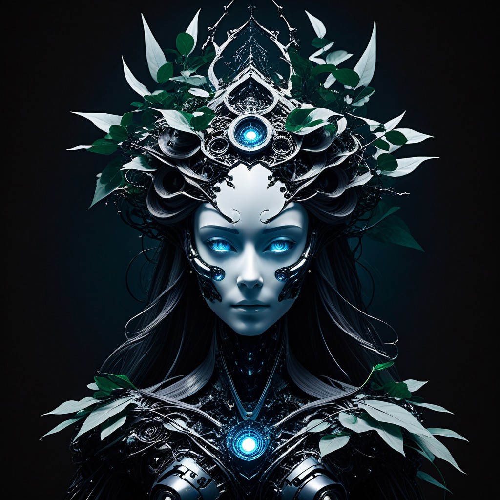 Studio Ghibli Dark Fairytale, intricate cyborg Portrait of a female Robotic entity with Long billowing Hair Made of leafs, black hollow eerie head, No Face, DARK moody