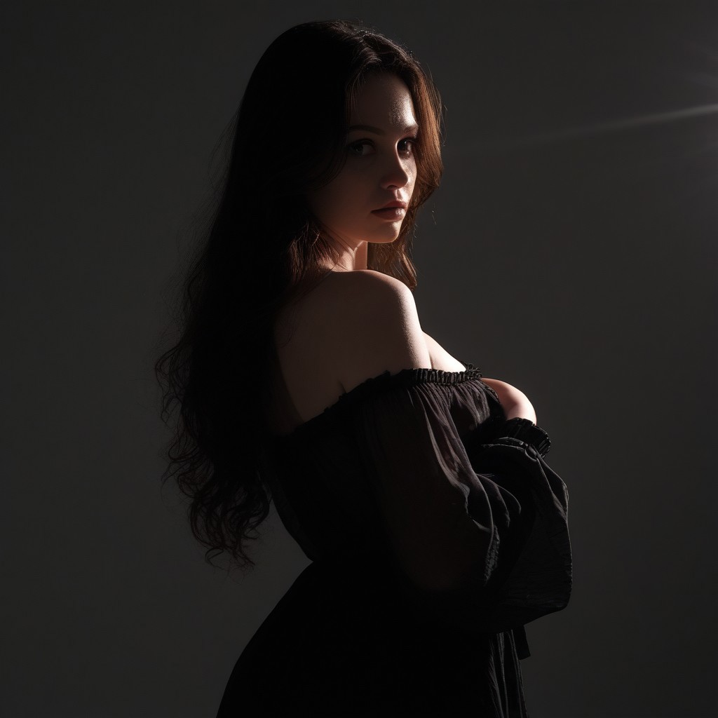 18y Goth girl, slim, small chest, wide hips, pretty figure, long long wavy hair, long hair, pretty dress, flowwy dress, shy face, pretty pose, slightly shear dress, dynamic view, looking over shoulder at viewer, sliding dress off one shoulder, nip slip, over the shoulder POV, over the shoulder down blouse, dress is off the shoulder far enough her boob is out, over the shoulder top POV, down blouse, dress drop, breast expose BREAK Dark scene, no light, dynamic dark lighting, night scene, warm light gently lighting face in beams