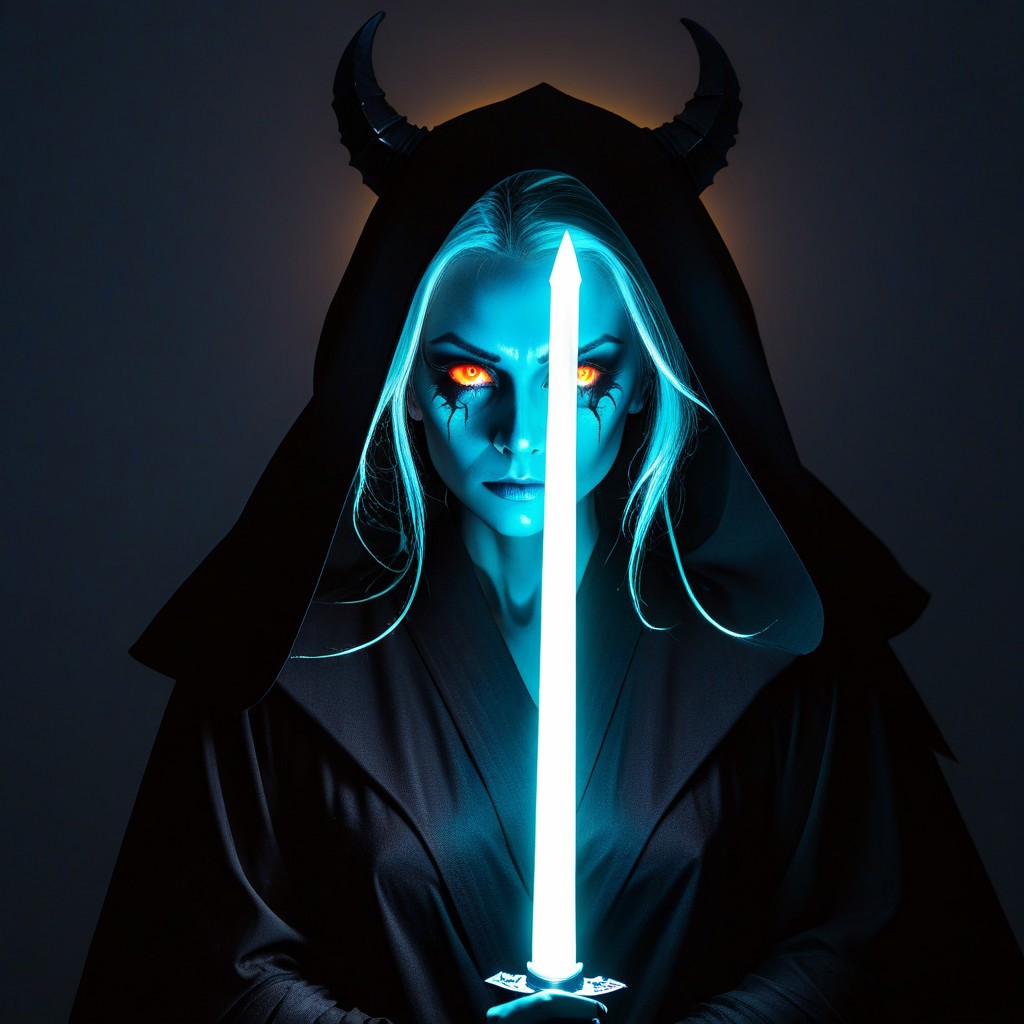 masterpiece, best quality, good quality, very aesthetic, absurdres, newest, 8K, depth of field, focused subject, close up, 1girl, demon face, solo, black jedi robe, glowing hair, looking at the viewer, heterochromia eyes, neon color palette, holding neon sword, eerie, dynamic lighting, shadows, silhouette, ghost in armor, dynamic angle,from side,