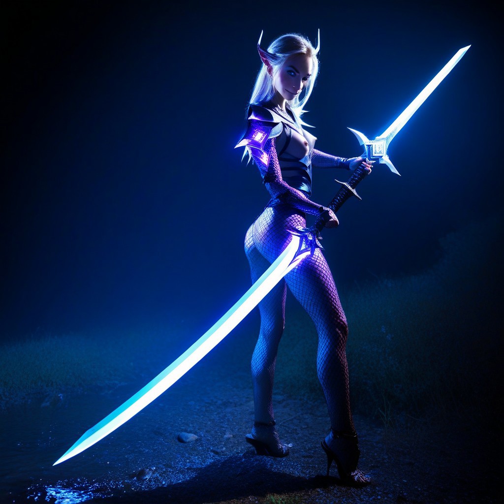 masterpiece, best quality, good quality, very aesthetic, absurdres, newest, 8K, depth of field, focused subject, dynamic angle, motion lines, from above, from side, in the style of ckgr, 1girl, glowing purple eyes, lips, smirk, flirting, slim legs, holding and wielding a large glowing rune sword, straps, fishnets, bioluminecent waterfall, dark, light effects, night, purple color palette