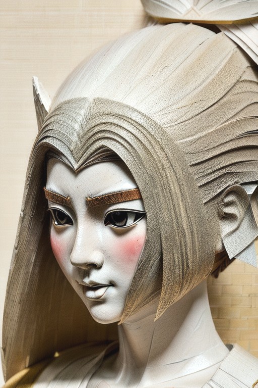 A beautiful and artistic paper cutout composition depicting a samurai warrior on a horse in an elegant, handcrafted style. The compositions are intricately cut from high-quality textured paper, with soft shadows cast onto the background, adding depth and dimension. Surrounding the samurai warrior are delicate paper cutout bonsai, and swirling decorative elements, creating a sense of traditional japanese art and craftsmanship. The lighting is soft and warm, enhancing the texture of the paper and giving the scene a handmade aesthetic. The background is a pale rising sun in a softly blurred gradient to keep the focus on the intricate details of the paper art.