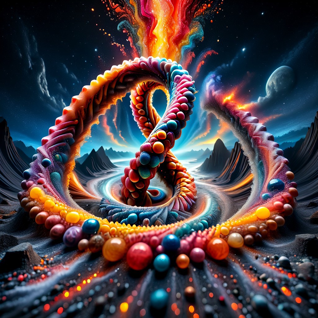 A spinning DNA helix shaped like a Penrose triangle, composed of vibrant and unique planets, each with distinct textures, colors, and patterns (some glowing, some ringed, some volcanic, some icy), floating in the vast expanse of space; the Milky Way stretching across the background in a radiant cascade of colors. Hyperrealistic 3D digital art, ultra-high definition, intricate details, cinematic lighting, dynamic motion, an ethereal glow, a masterpiece aesthetic, and cosmic dust that adds a sense of depth and wonder.