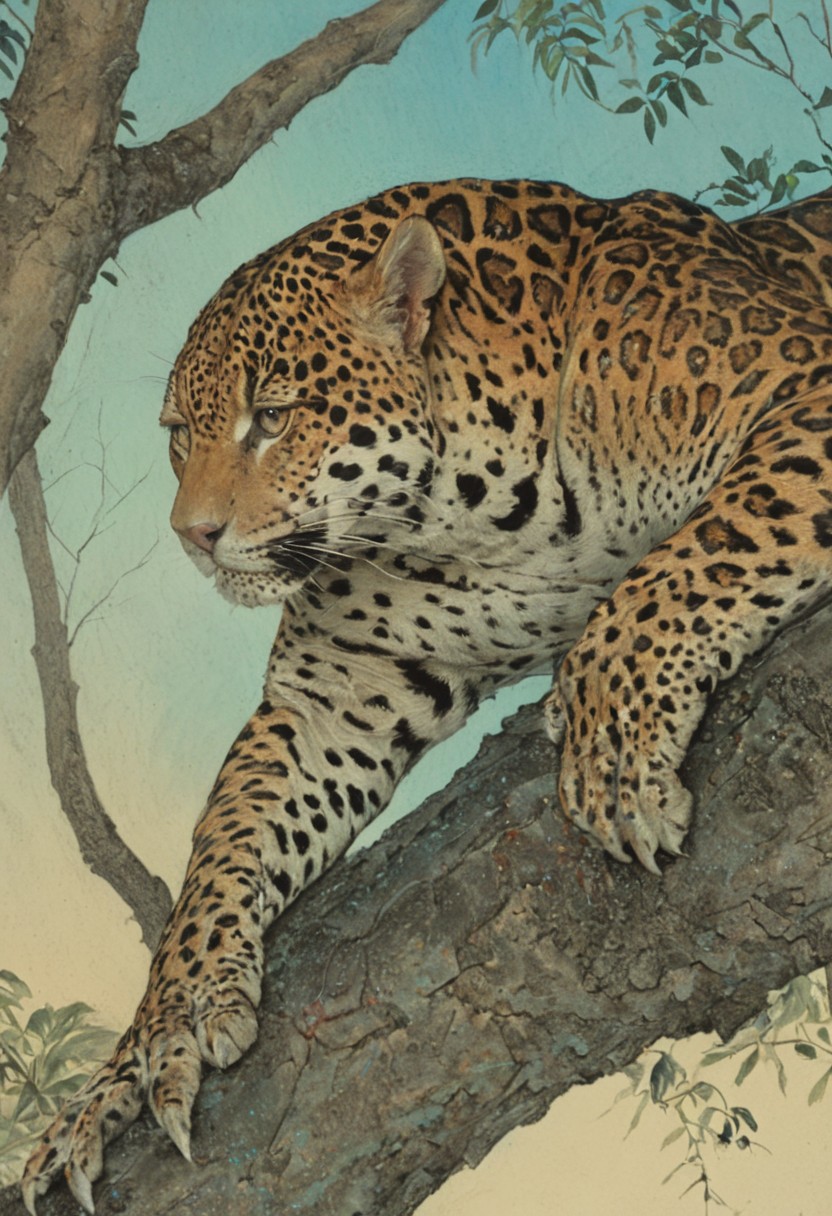 (highly detailed), (hyper realistic), ArsMJStyle, Colored pencil hyperdetailed realism, oil painting on hard paper, jaguar resting on a thick tree branch, the jaguar is rendered entirely in layered oil paint with precise brush texture, dense fur detailing, and realistic muscle contour, spotted coat gleaming under soft filtered light, its expression calm and alert, claws slightly visible as it grips the bark, BREAK the tree branch, surrounding foliage, and distant background are painted in soft watercolors and pastel tones, with smooth gradients and loose brushwork, blending sky blues, muted greens, and warm earth tones to create depth and atmospheric perspective, subtle contrast between the sharp oil texture of the jaguar and the fluid pastel-wash environment enhances focal tension, BREAK** the composition feels serene yet powerful, blending medium contrasts for visual harmony, fine surface grain from paper subtly visible in background, delicate pastel dust edges and watercolor bleed giving softness to the jungle ambiance, painterly mix of control and looseness, artistic study in material duality.