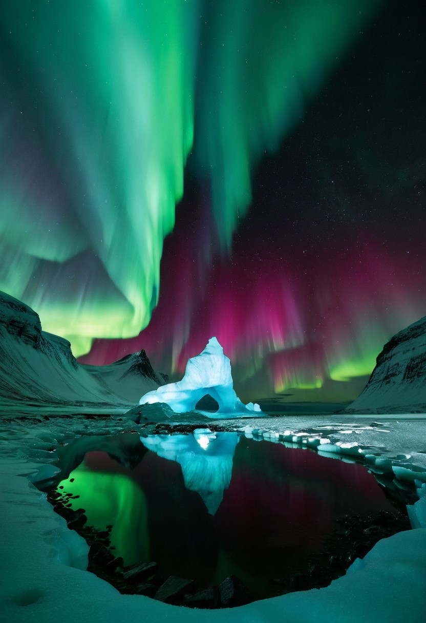A digital landscape photograph captures the view from inside a massive ice cave in the Arctic. The cave's crystalline walls frame a spectacular display of the aurora borealis, which fills the night sky with swirling curtains of turquoise and green light. Snow-covered mountains stretch across the horizon beneath the celestial show. A solitary figure stands in silhouette at the cave's opening, their dark form contrasting dramatically with the luminous sky. The cave floor features a still pool of water that perfectly mirrors the aurora and cave ceiling, while scattered dark rocks break up the snowy ground. The scene is captured using an extreme wide shot with a low-angle perspective, emphasizing the grand scale of the natural formation and the cosmic display above. Low-angle wide-angle photograph with dramatic natural lighting shows sharp details in dark and bright areas.