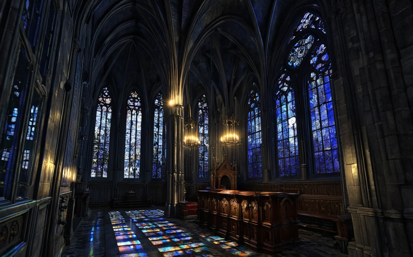 (masterpiece, best quality, ultra-detailed,newest, very aesthetic), a low saturation impasto of dark fantasy style gothic church at night has clock altar with long corridor all moonlight rays from side painted glass windows,ray tracing,wide_shot from above,8K,<lora:detailed_notrigger:1>,
