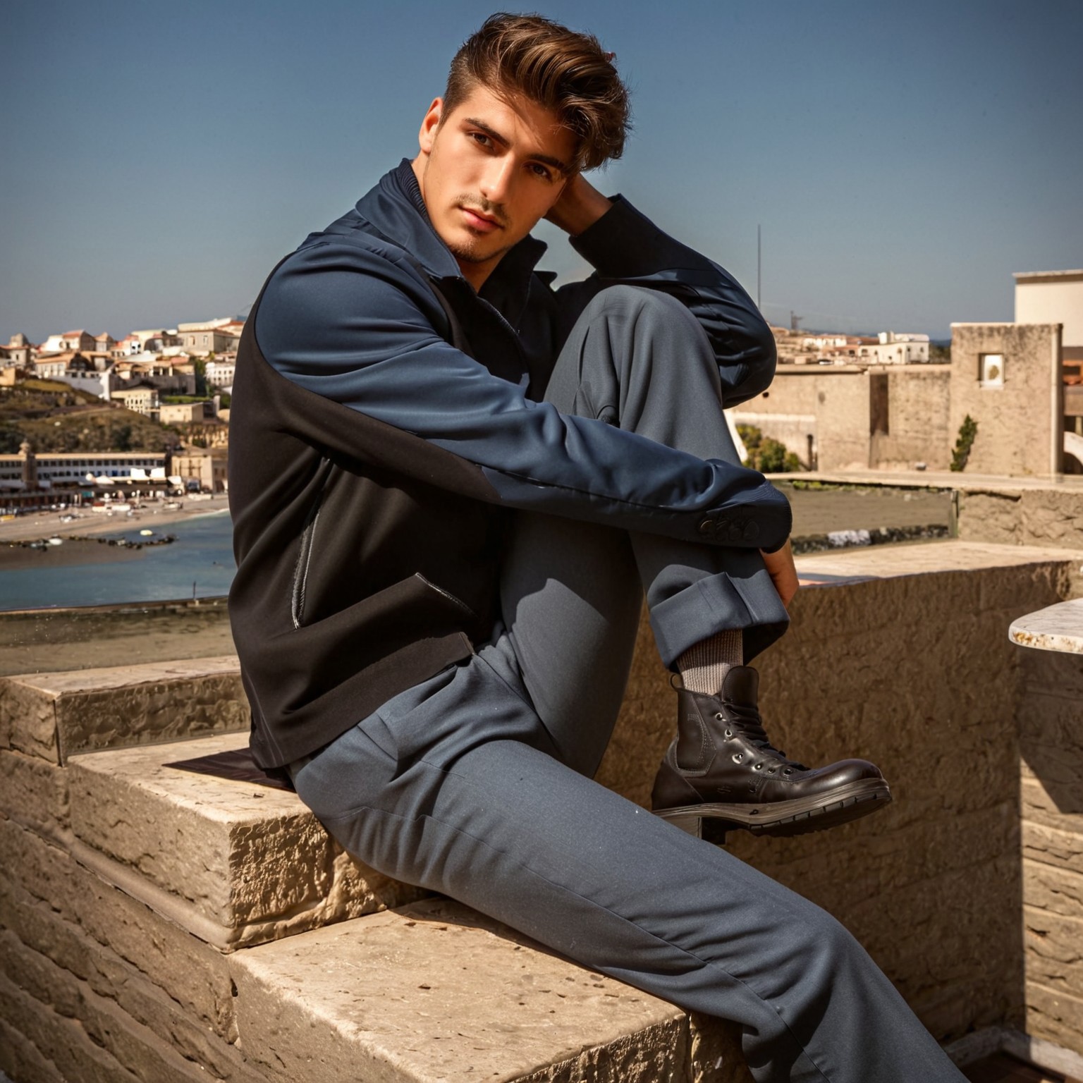 male focus, (best quality, 8K, high resolution, extreme detail, outstanding composition:1.4), (a photo of a young Italian man), wearing a black jacket, black pants, relaxed pose, casual style, sitting outdoors, on a patio with stone wall, city buildings in background, natural sunlight, outdoor setting, photorealistic style, medium shot, subject positioned center, facing slightly to the viewer, sharp focus, clear composition, vibrant colors, (detailed skin texture:1.2), outdoor cafe setting, calm atmosphere, clear day, high detail, BREAK ((insanely handsome boy)), ((detailed face))), (((perfect detailed handsome face))), brown hair, dark blue eyes, crew cut hair, Sicily, Italy, Mediterranean landscape, BREAK Technicolor style, Classic Film Noir style, 1950's Technicolor style, closeup, luisap, eyes