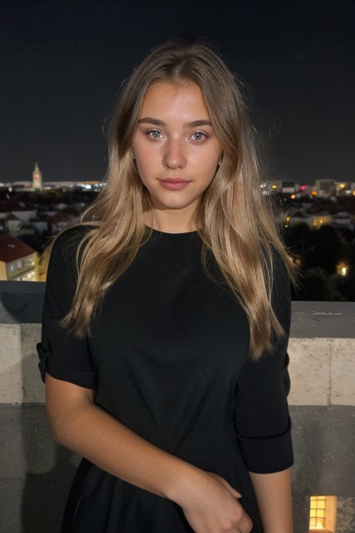 instagram photo, closeup photo of 18 years old instagram model, cute face, dressed in simple black dress, dirty blonde long hair, tanned skin, happy, beautiful hazelnut eyes, hourglass figure, overexposed filter, full body, in Bratislava, Slovakia, city skyline, night city in the background